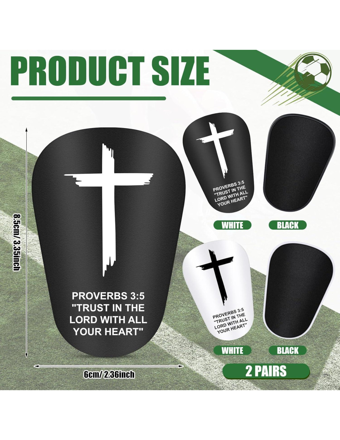 - Paquete Incluye: cada kit incluye 2 pares de mini espinilleras de fútbol, con un diseño clásico en negro y blanco; El tamaño compacto de 8.5 x 6 cm asegura un ajuste seguro mientras que el motivo de la cruz y el versículo bíblico inspirador "PROVERBIOS 3:5" añaden un aliento significativo para los atletas basados en la fe