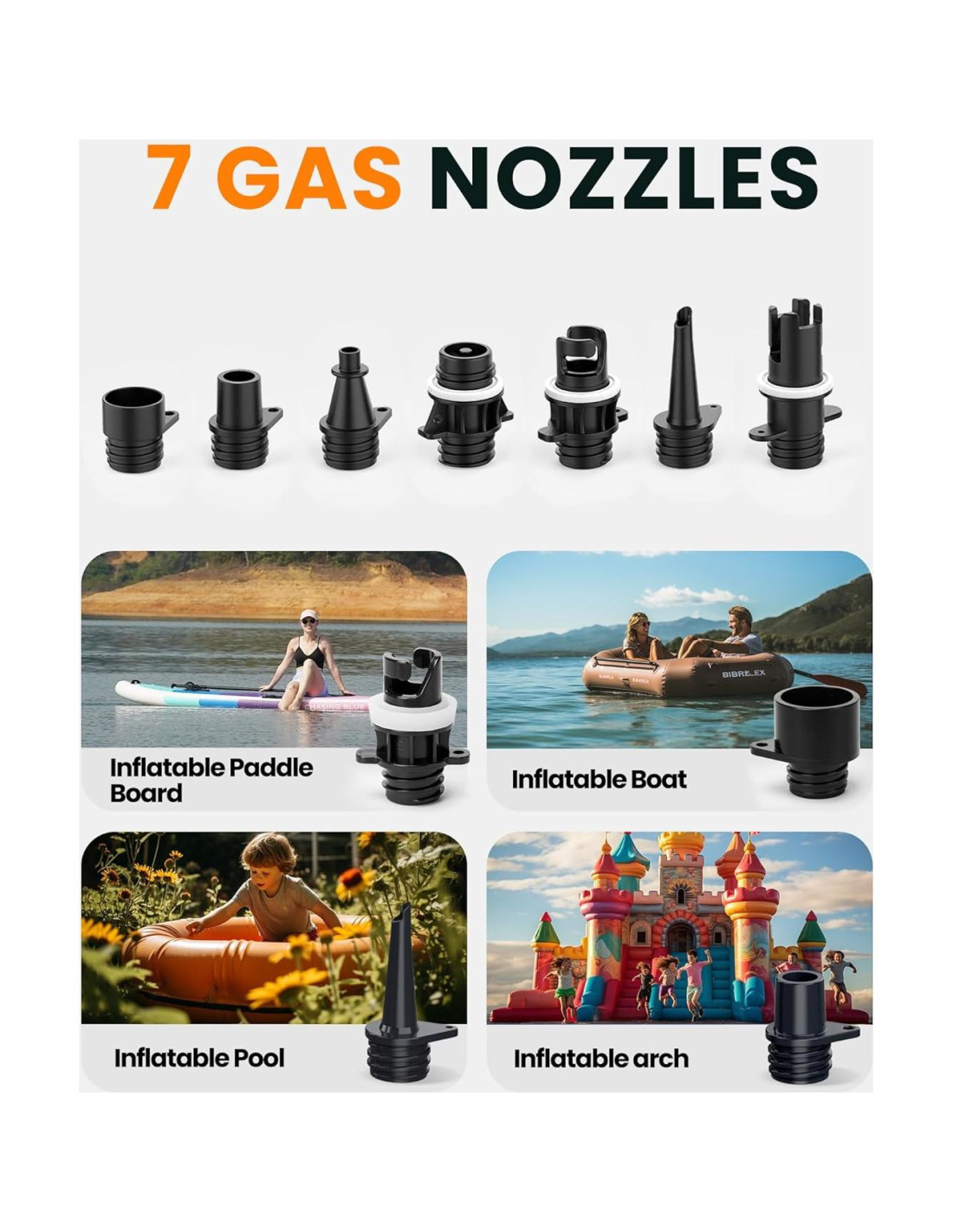 - Conector de coche de 12V DC y juego completo de boquillas - Se conecta al conector de 12v dc de tu coche. Cuenta con un fusible de 12A para mayor seguridad. La bomba de aire eléctrica sup viene con 7 boquillas para adaptarse a la mayoría de los inflables de alta presión como tablas de paddle inflables, camas de aire, kayaks, barcos, arcos, piscinas, tiendas de campaña, etc. Atención: Si la boquilla no es adecuada para tus inflables, podrías intentar cambiar las juntas blancas.