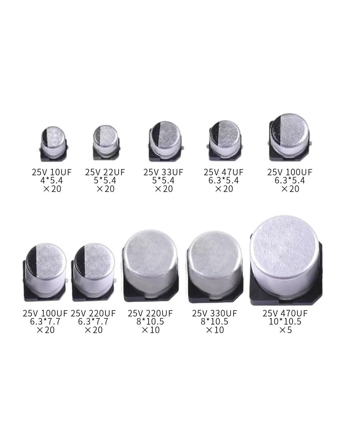 - 10 Valores 165 Pcs Kit de Surtido de Capacitores Electrolíticos SMD de Aluminio de 25V