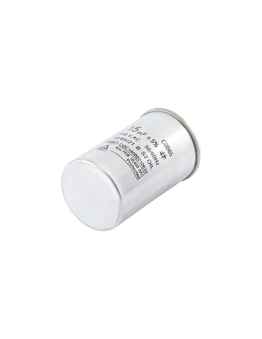 - Capacitor de 15UF 450VAC con +/-5% de desviación para operación precisa en fuentes de energía de CA a frecuencias de 50/60Hz. Temperatura máxima de +85C y mínima de -25C. Perfecto para compensación del factor de potencia en luminarias de alta potencia y operación continua de motores