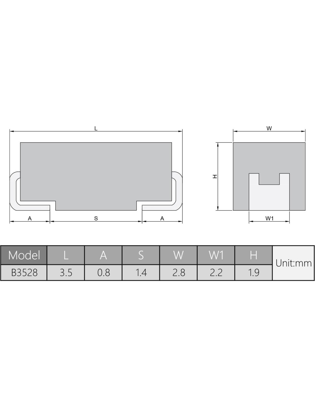 - [Dimensión] -Modelo:Patch/3528/B/100uF/6.3V;Capacitancia:100uF;Voltaje:6.3V;Tamaño:4x3x2mm(0.16x0.12x0.08in)