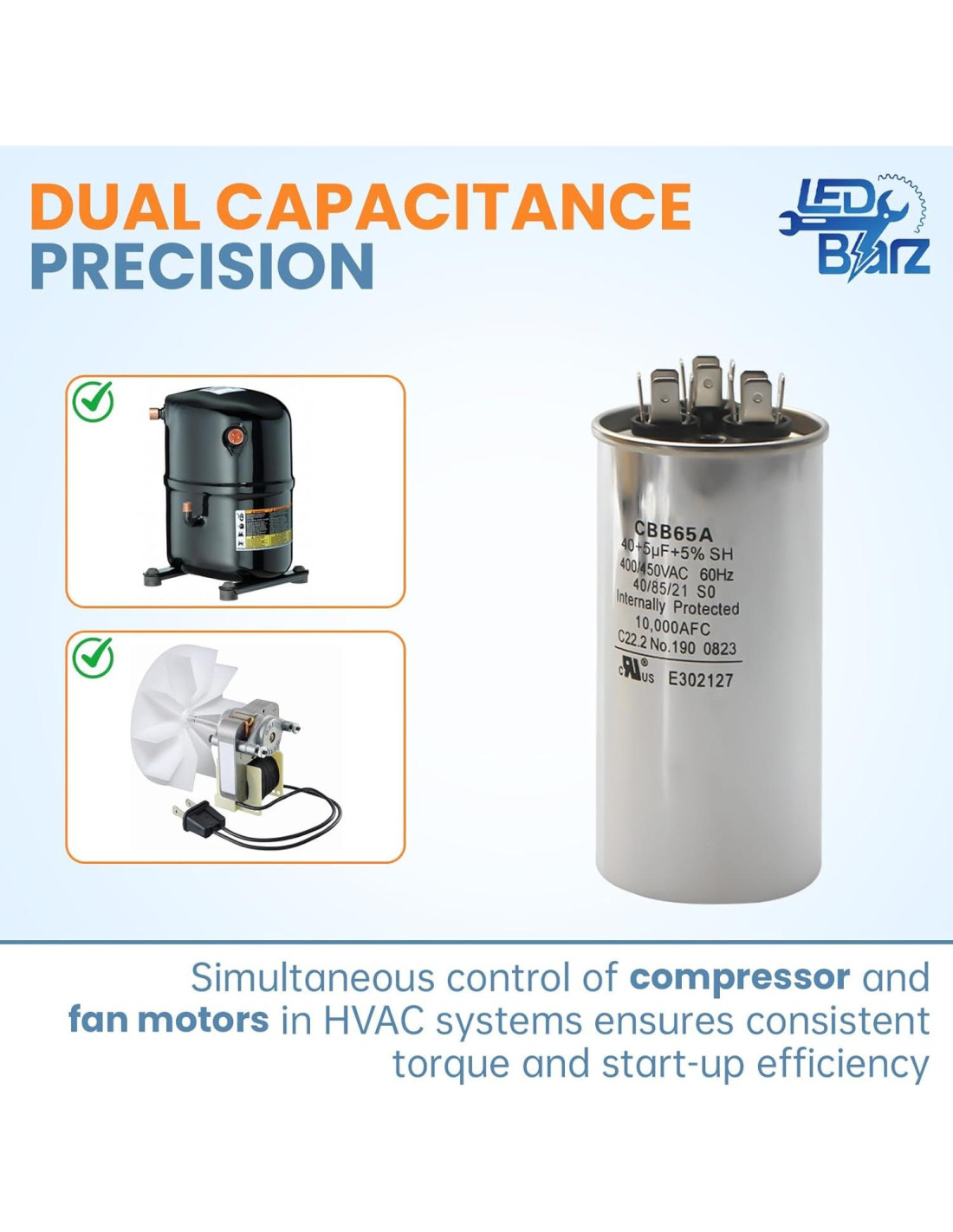 - Precisión de Capacitancia Doble - Diseñado con 40+5 uF/MFD de capacitancia dual para el control simultáneo de compresores y motores de ventilador en sistemas HVAC asegurando un par constante y eficiencia de arranque