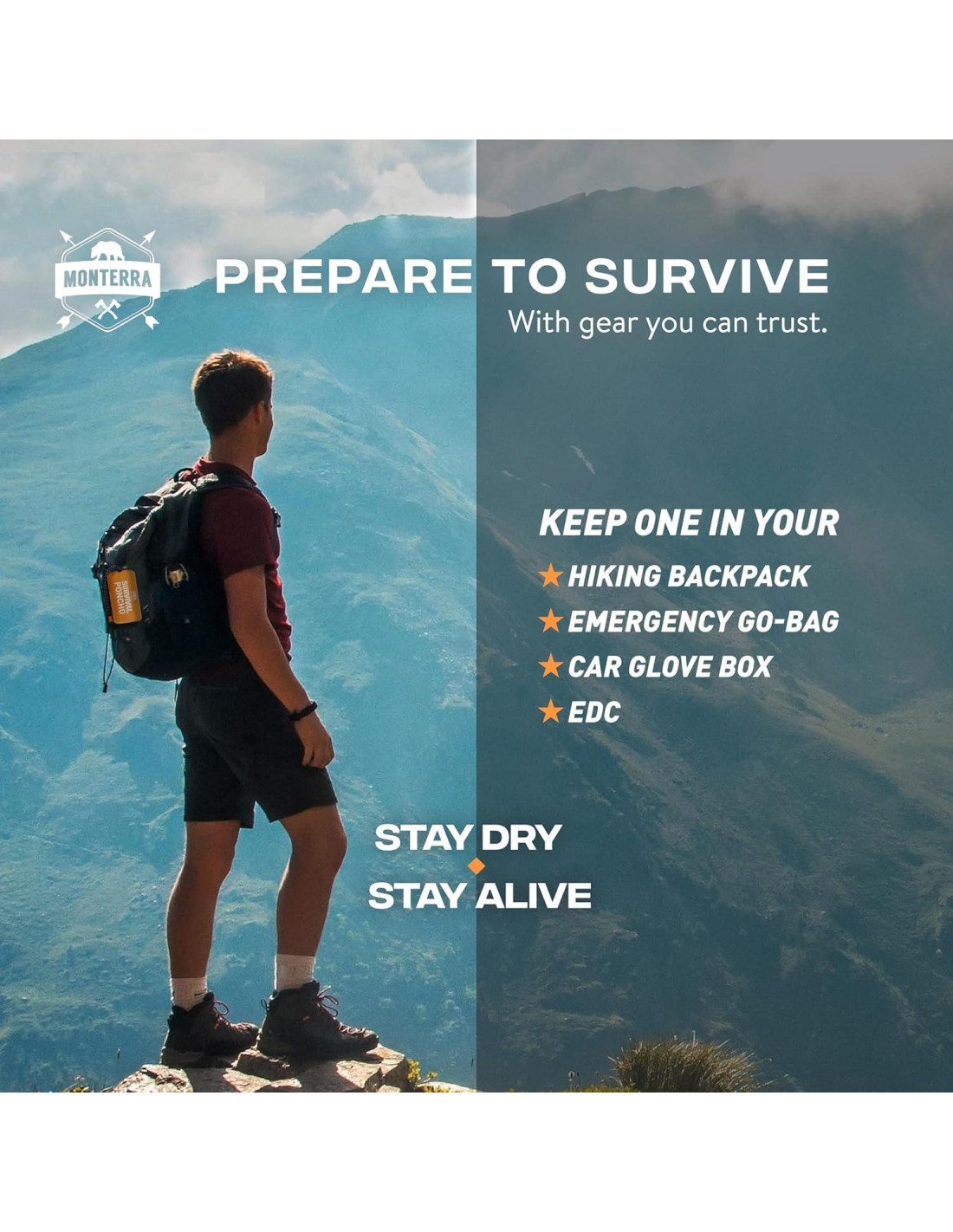 Ubicado en el corazón de la dura naturaleza de Wyoming, Monterra es una marca de supervivencia al aire libre nacida del espíritu indómito del Oeste Americano. Fundada por un ex Guía de Trekking e Instructor de Supervivencia en la Naturaleza en el Parque Nacional Yellowstone, nuestra marca encarna un legado de experiencia, resiliencia y una profunda conexión con la gran naturaleza. Bienvenido a la naturaleza intransigente, donde la supervivencia no es un juego, es un estilo de vida. Poncho de Supervivencia de Emergencia ultra compacto. Pesando solo 85.05 g (3 oz), incluye un silbato de emergencia. Se ajusta cómodamente en una bolsa de nylon para facilitar el transporte. El material Mylar te mantiene caliente y seco. El tamaño amplio del poncho cubrirá una mochila de senderismo para mantenerte a ti y a tu equipo completamente secos. El material Mylar es 100% impermeable, manteniéndote caliente y seco en condiciones climáticas adversas. Su superficie reflectante retiene hasta el 90% de tu calor corporal. Poncho de Mylar duradero: Resiste desgarros y perforaciones. Reutilizable cuando se seca y se pliega cuidadosamente de nuevo en la bolsa, asegurando una fiabilidad duradera. Poncho de Supervivencia Kit de Supervivencia 265 Pcs Pulsera de Paracord Mantitas de Emergencia Bolsa Táctica de Hombro Cuchillo de Supervivencia.