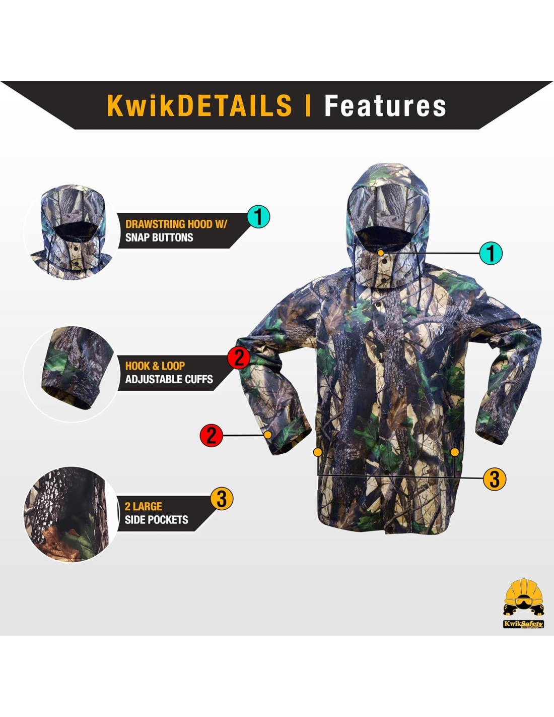 - CALIDAD Y COMODIDAD - Nuestro traje de lluvia de camuflaje KwikSafety HUNTSMAN cubre las 3 W: a prueba de viento, a prueba de agua y a prueba de todo clima. Nuestro traje de lluvia de 3 piezas (chaqueta, pantalones y bolsa portátil) está hecho de material 100% poliéster / PVC con estampado de camuflaje. El material se combina con un cordón ajustable, cremalleras de alta resistencia y botones a presión para evitar que el agua entre en el traje.