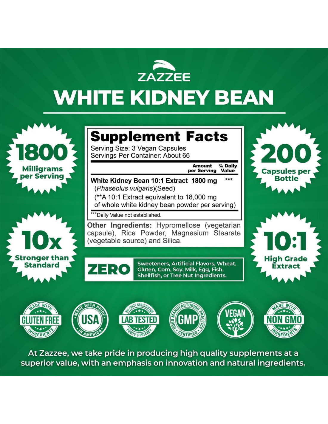 Hacemos suplementos de calidad asequibles.... Naturalmente. ¡Sé parte de la familia Zazzee! Frijol Blanco Té Verde Extracto Extracto de Cereza Ácida Cardo Mariano Orgánico Extracto de Semilla de Uva Extracto de Arándano Orgánico Extracto de Mullein El Extracto de Frijol Blanco Zazzee contiene 1800 mg por cápsula y se deriva de un potente extracto 10:1. El Suplemento de Frijol Blanco Zazzee contiene 200 cápsulas. Nuestras cápsulas concentradas ayudan a tu cuerpo a eliminar carbohidratos, evitando que sean completamente digeridos. Con el Extracto de Frijol Blanco Zazzee Naturals, ¡puedes convertir tus bocadillos altos en calorías en bocadillos bajos en calorías! Nuestras Cápsulas de Extracto de Frijol Blanco Zazzee de Fuerza Extra son 100% veganas, todo natural y no transgénicas.