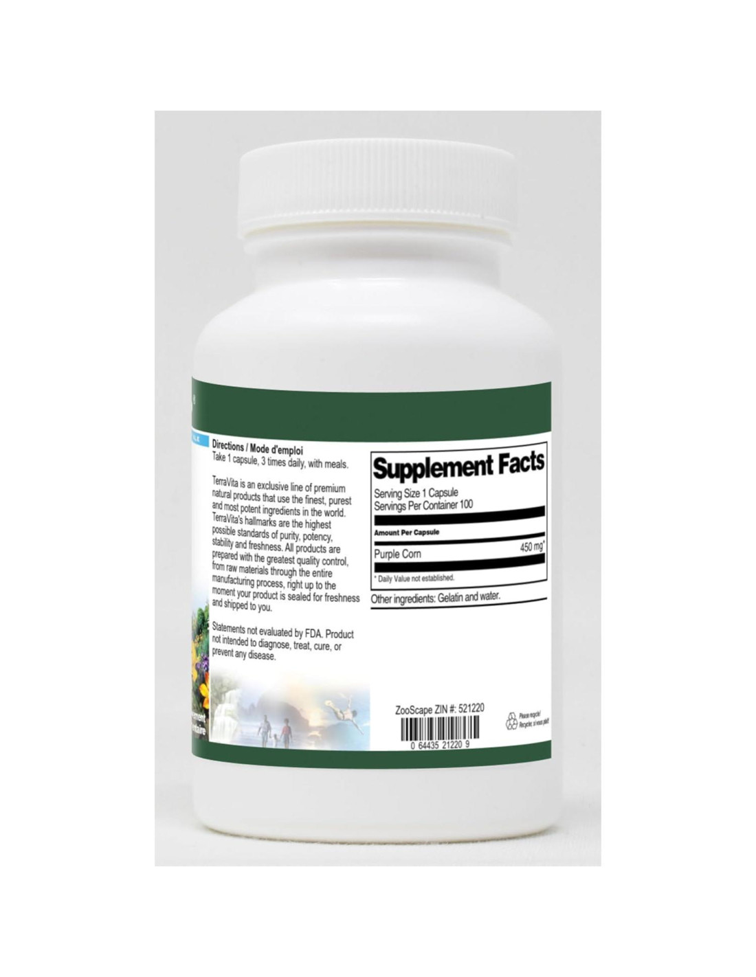 Maíz Morado - 450 mg (100 cápsulas, ZIN: 521220) Empacado en los Estados Unidos en una instalación certificada por GMP (Buenas Prácticas de Manufactura). Sin rellenos. Fabricante: TerraVita Tamaño: 100 cápsulas Cápsulas fáciles de tragar en un frasco sellado. Ingredientes: Gelatina, Agua, Maíz Morado - 450 mg
