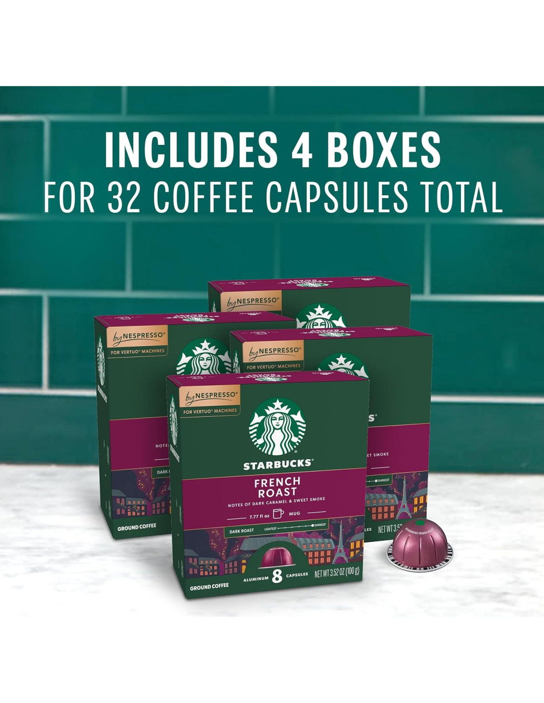 - CÁPSULAS STARBUCKS POR NESPRESSO: Disfruta del café Starbucks que conoces y amas con estas 4 cajas de cápsulas de café Tostado Francés para máquinas Nespresso Vertuo. 32 cápsulas en total