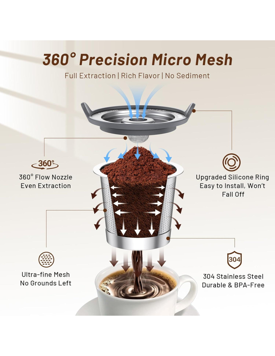 - [Micro Malla 360 Optimizada para Extracción Completa de Sabor] Nuestras cápsulas de café reutilizables cuentan con micro-perforaciones de precisión en la parte inferior y las paredes laterales, permitiendo que el agua infunda completamente los posos de café para una taza rica y aromática. La parte superior sellada ayuda a retener la presión para una mejor crema y un sabor más audaz.