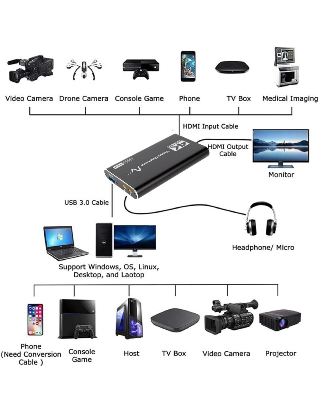 - La señal de video grabada puede alcanzar 1080p / 60Hz, la entrada HDMI admite 4K / 30Hz.