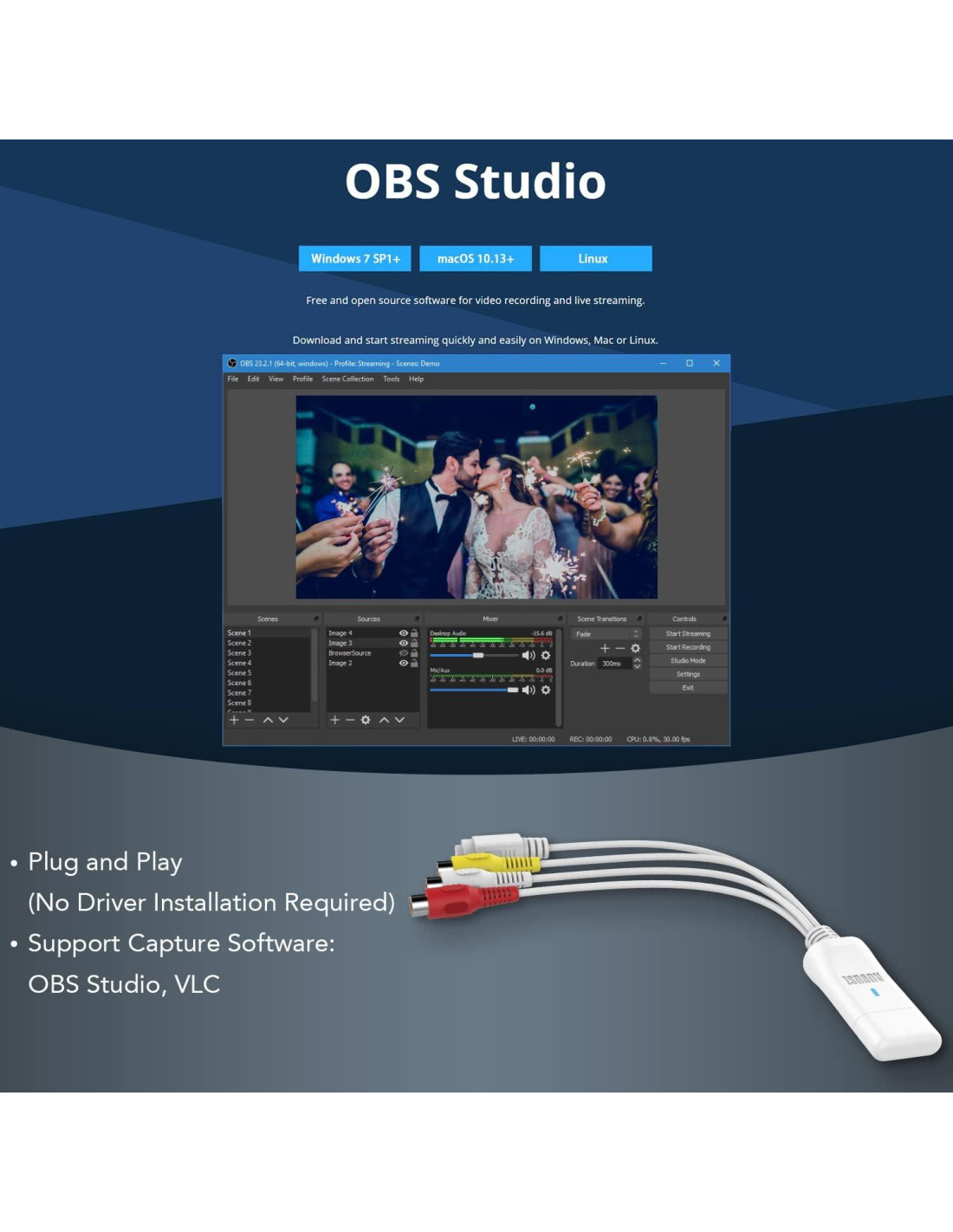 - Compatible con OBS Studios - Conecta tu VGB300 a OBS studios, permitiéndote grabar tu material fácilmente y compartirlo en Facebook, YouTube, etc. Comparte tus juegos favoritos con tu comunidad y recuerda los mejores juegos de tu infancia. También funciona con otro software de captura como Honestech, que tiene capacidades de grabadora de DVD.