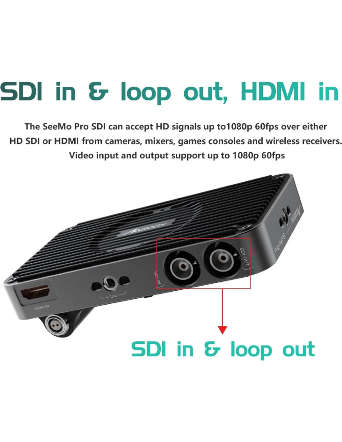 - SDI Entrada y Salida en Bucle: El equipo de monitoreo inteligente Accsoon SeeMo Pro cuenta con conexiones HDMI y SDI que soportan entradas de video 1080p 60 fps de cámaras, mezcladores, consolas de juegos, etc.