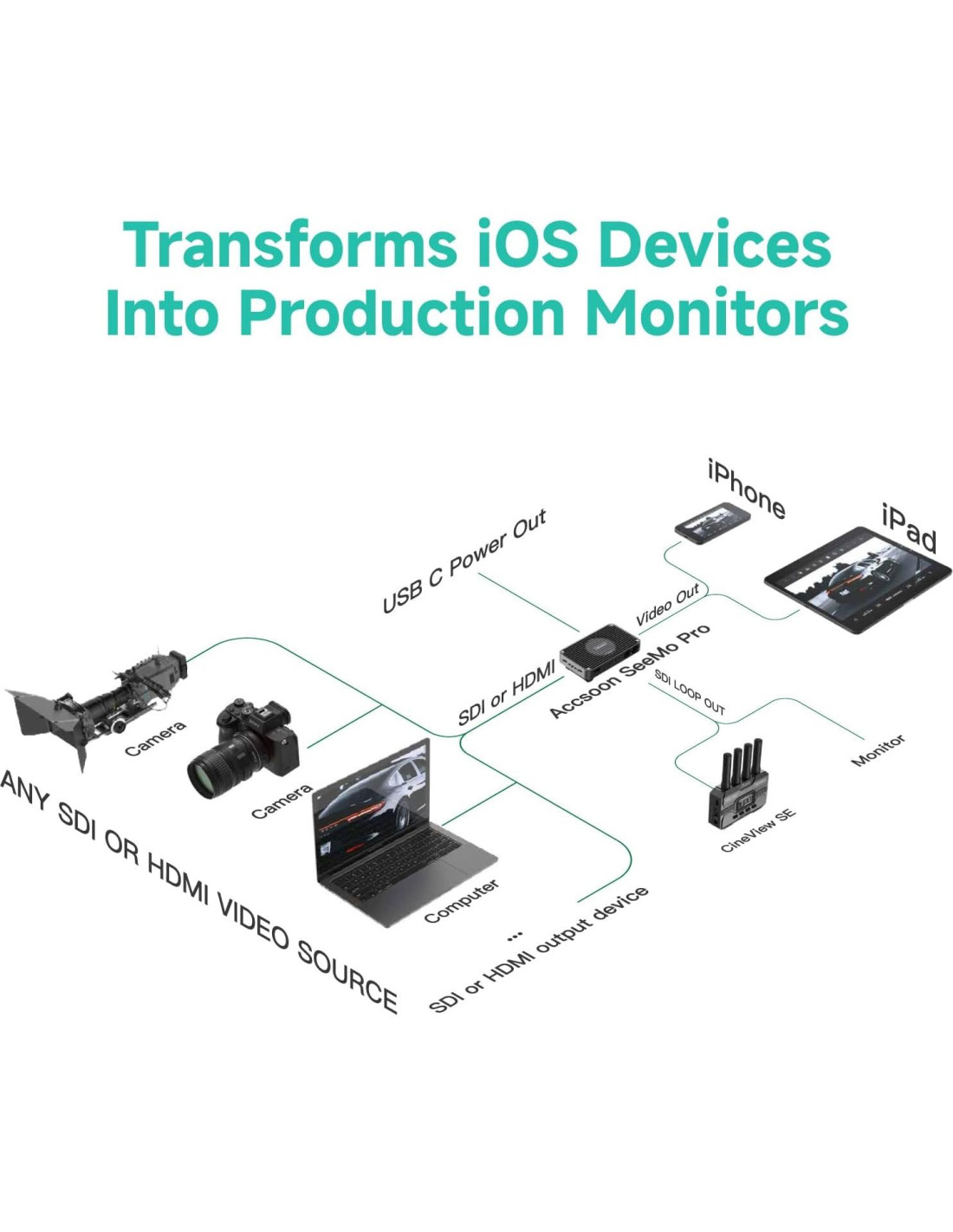 - Amplia Compatibilidad: El adaptador de captura de video Accsoon SeeMo Pro es compatible con dispositivos iOS 12.0 o posteriores, y puede conectar iPad 6, 7, 8, 9, 10, iPad Pro 9.7, 10.5, 11, 12.9 pulgadas, iPad Air 3, 4, 5, iPad Mini 5, 6, A17 Pro. SeeMo Pro también se puede usar con Accsoon iPad PowerCage, CineView 2SDI/SE/Quad y otros dispositivos con salida SDI.
