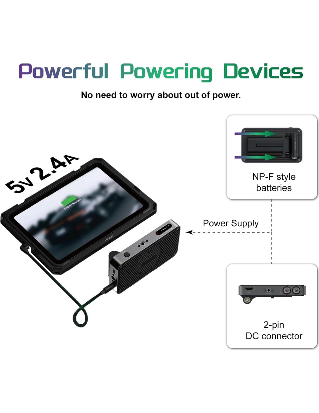- Fuente de Alimentación: El adaptador SeeMo Pro es increíblemente eficiente en energía y funciona con baterías NP-F 550/750/970 o a través de un conector DC de 2 pines de grado profesional. Puede suministrar 5 V/2.4 A de energía a un iPad, iPhone, micrófono, luz de cámara, etc.