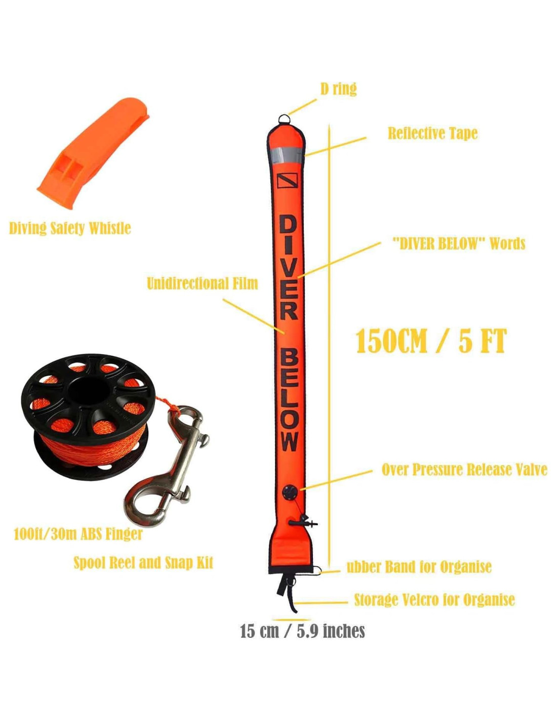 - [LO QUE OBTIENES]: Marcador de Superficie de Buceo X 1; Carrete de Buceo de 100FT X 1; Silbato X 1.