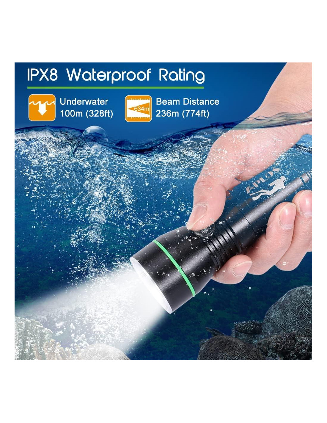 - CLASIFICACIÓN IPX8 IMPERMEABLE: La linterna de buceo profesional AP30 está hecha de aluminio de grado aeronáutico, equipada con anillos O adicionales y un diseño de sellado especial, alcanzando el nivel de impermeabilidad IPX8, resistencia a la abrasión y a la corrosión del agua de mar. Este equipo profesional de linterna de buceo y esnórquel está disponible bajo el agua a 100m (328ft).
