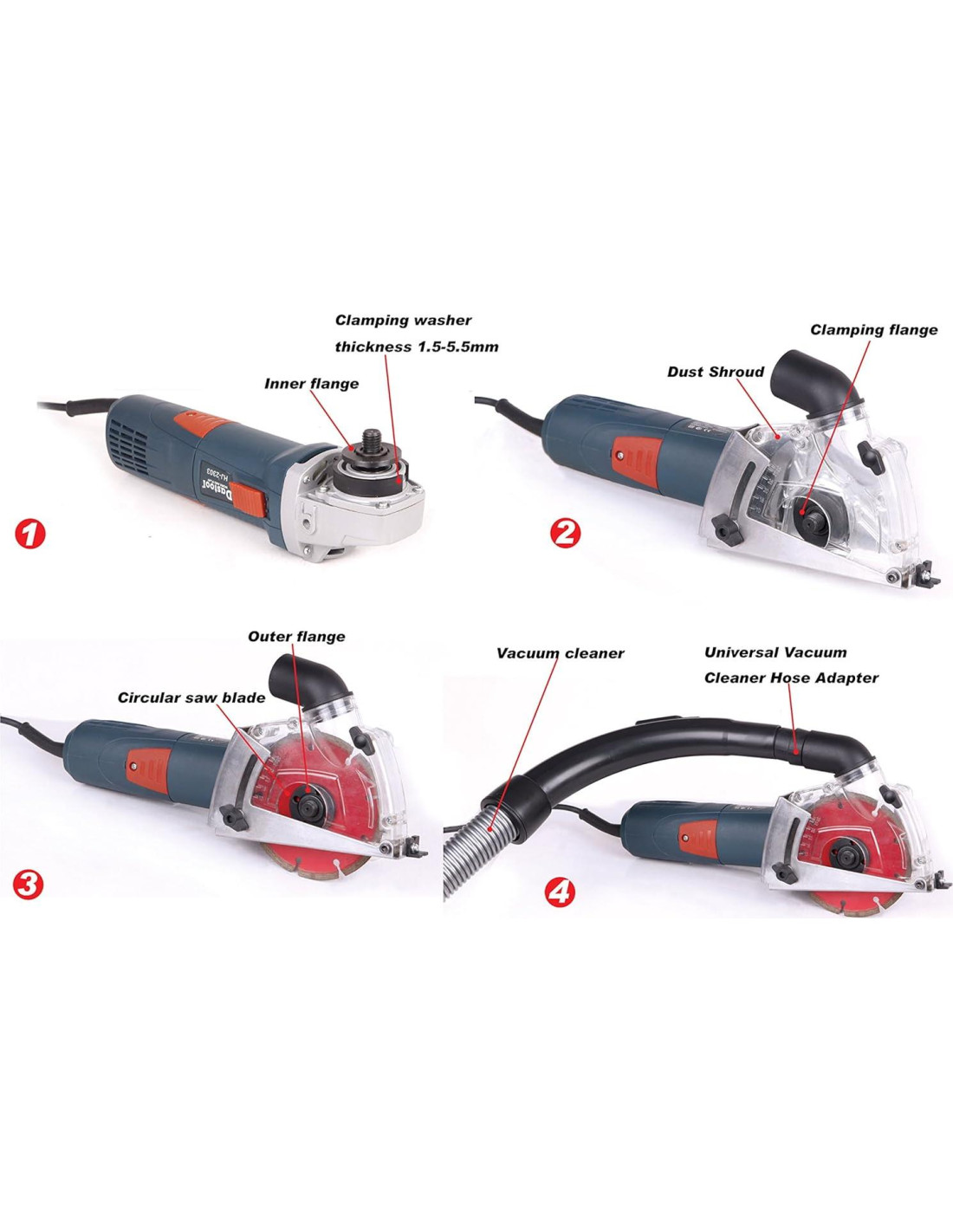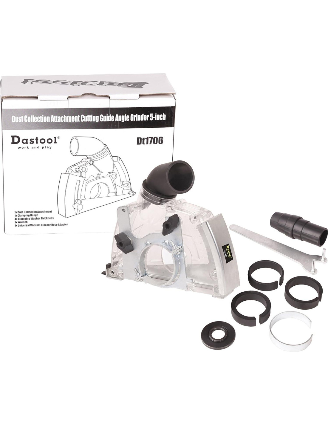 El Dastool Dt1706 ofrece la mejor recolección de polvo de su clase, mejora la seguridad para el usuario y para todo el lugar de trabajo. Reduce el tiempo de limpieza y proporciona aire más seguro para el usuario. Ofrece una instalación sin herramientas fácil para mantener la productividad, pero sin reducir la seguridad. Un solo tornillo ajusta rápidamente y mantiene la profundidad de corte deseada. Compatible con aspiradoras sin necesidad de adaptadores. La caja contiene lo siguiente: 1x Capuchón de Polvo, 6 piezas de arandela de sujeción de grosor 1.5-5.5mm, 1x brida de sujeción, 1x llave para capuchón, 1x Adaptador de Manguera de Aspiradora Universal, 1x Guía del Usuario. Adecuado para Hitachi, Makita, Dewalt, Kress, Ryobi, etc. 85% de las principales marcas con amoladoras angulares de 4"/5".