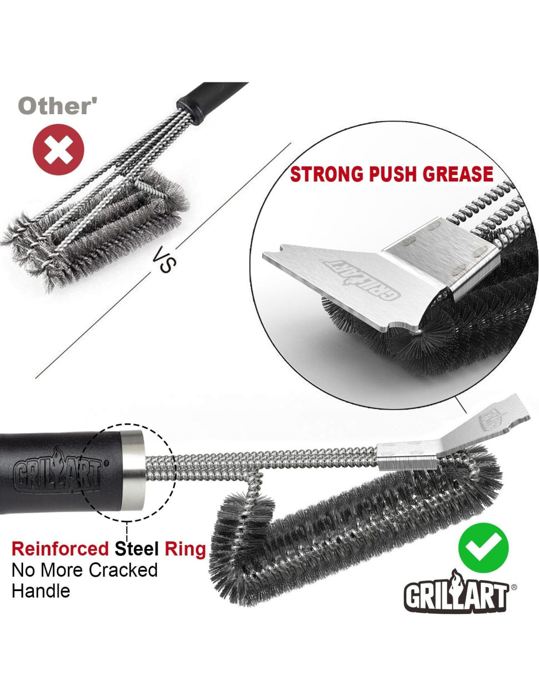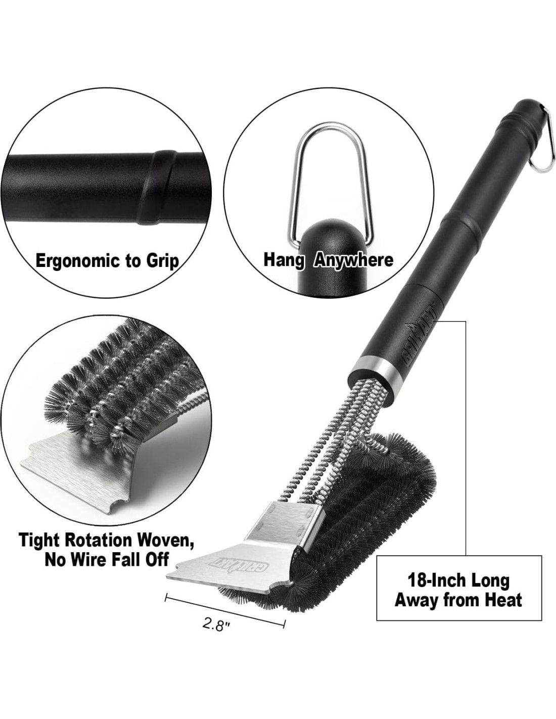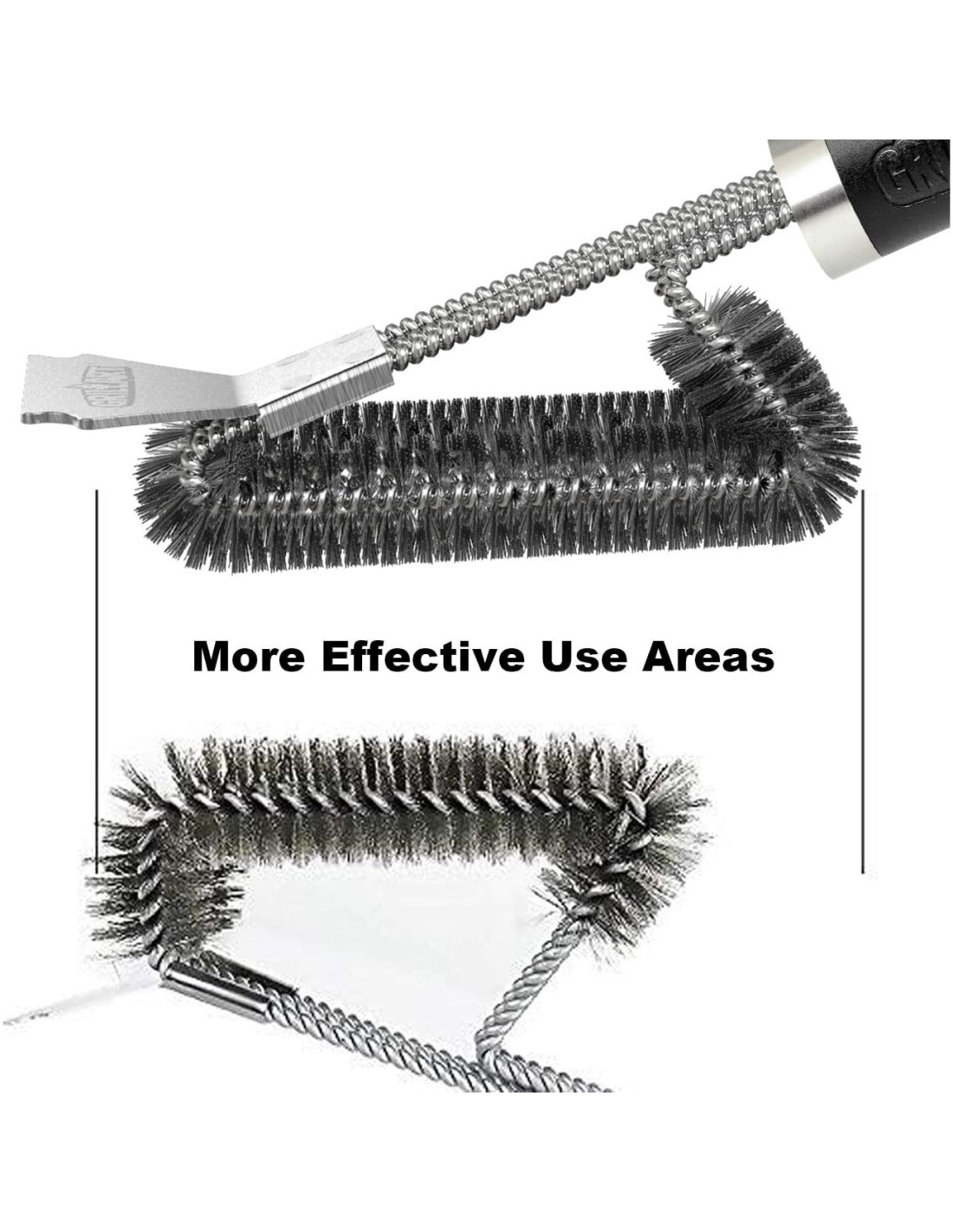 - [Limpieza Fácil] : Consiste en 3 filas de cerdas de acero inoxidable más gruesas que están en perfecto equilibrio entre rígidas y flexibles - ni demasiado rígidas para causar rasguños no deseados ni fáciles de aplastar que lleven a ser inútiles, con solo una simple rotación, puedes limpiar a fondo cada rincón y borde de tu parrilla, no solo la parte superior; Junto con un raspador sólido y afilado adicional, reducir tu tiempo de limpieza a la mitad definitivamente no es un sueño!