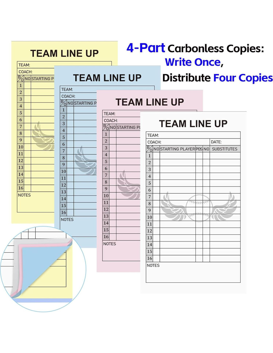 - Copias Carbonless de Cuatro Partes: Simplemente completa las tarjetas de alineación de softbol una vez, guarda la copia principal para ti, y distribuye las tres copias carbonless al árbitro, al equipo contrario y al anotador oficial, ahorrando tiempo y esfuerzo.