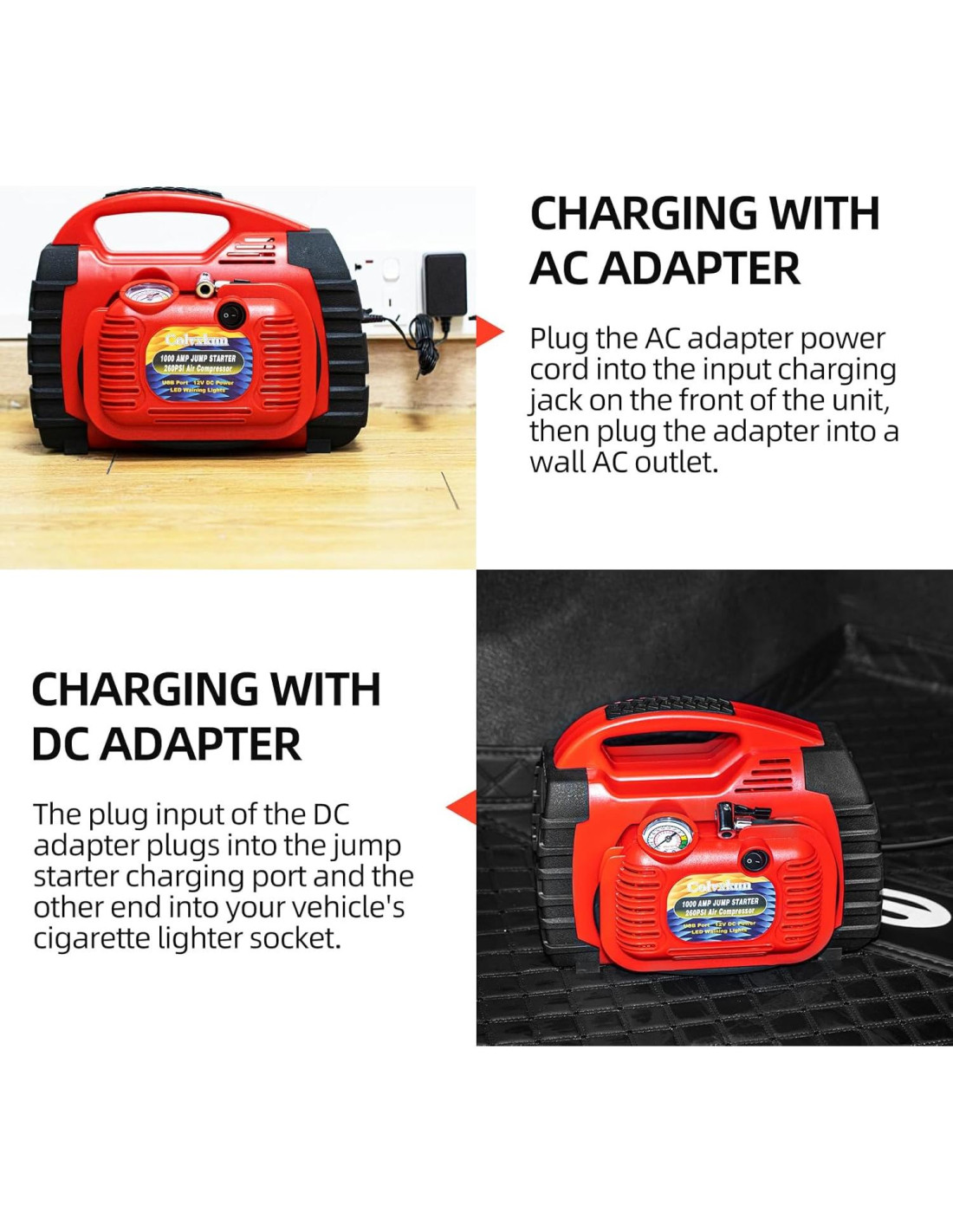 - [Qué hay en el paquete] 1* Paquete de batería de arranque de automóvil, 1* Cargador AC, 1* Cargador DC, 3* Boquilla de aire, 1* Guía del usuario. Si surge algún problema, no dudes en contactarnos. Nos esforzamos por crear un paquete de arranque seguro y confiable.