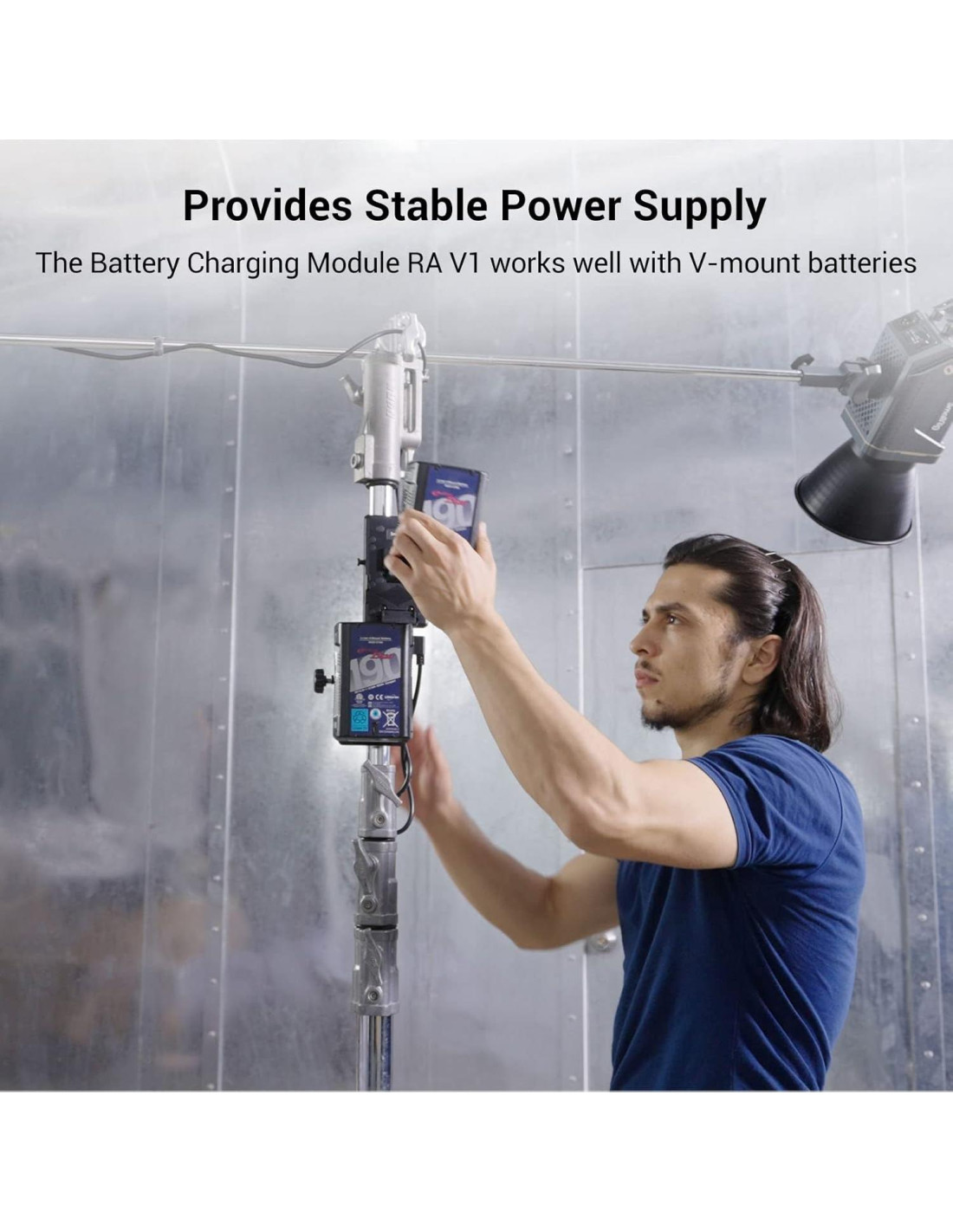 - Carga V-Mount: Esta placa proporciona eficientemente un suministro de energía estable para luces COB, haciendo que el proceso de grabación sea más seguro y estable. Funciona bien con tus baterías V-mount