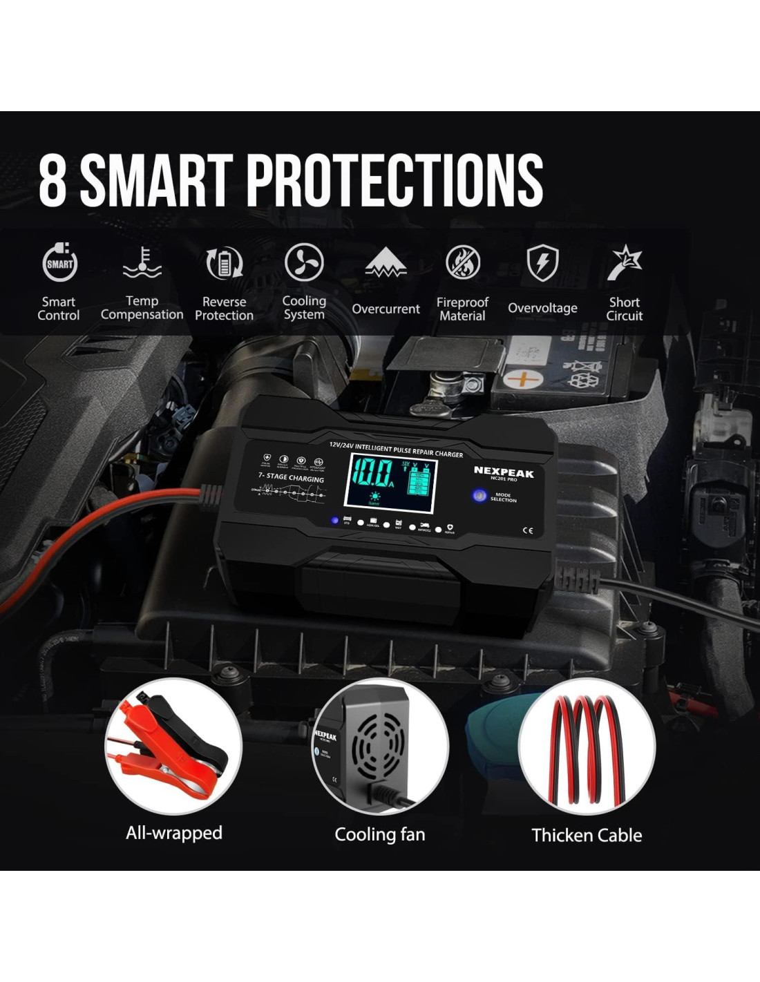 - CARGADOR RÁPIDO DE 10 AMPERIOS 12V 10 Amperios y 24V 5 Amperios, cargador y mantenedor de batería de 7 etapas, la velocidad de carga es mucho más rápida que los cargadores automáticos de 8 Amperios o 5 Amperios. Carga o repara todas las baterías de plomo-ácido automotrices, marinas y de ciclo profundo de 12 voltios y 24 voltios, incluyendo AGM, GEL, SLA, inundadas en coches, camiones, SUV, motocicletas, cortacéspedes, barcos marinos, etc. NUEVO REEMPLAZO DISPONIBLE PARA CUALQUIER PROBLEMA DE CALIDAD DENTRO DE 2 AÑOS.