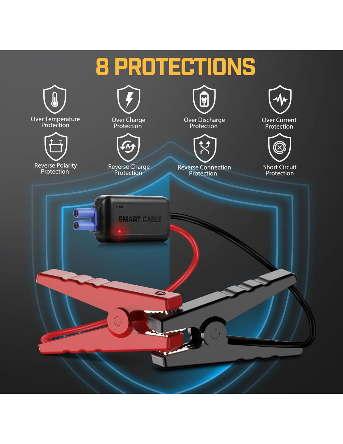 - Cables de Abrazadera de Alta Resistencia: Arrancadores de salto para automóviles actualizados con longitud extendida para alcanzar terminales de batería variados, cable más grueso para mejor conductividad, mayor rango de apertura para facilidad de uso, 8 protecciones integradas y alarmas visibles para detectar automáticamente la conexión, liberará todas sus preocupaciones sobre operaciones incorrectas y chispas.