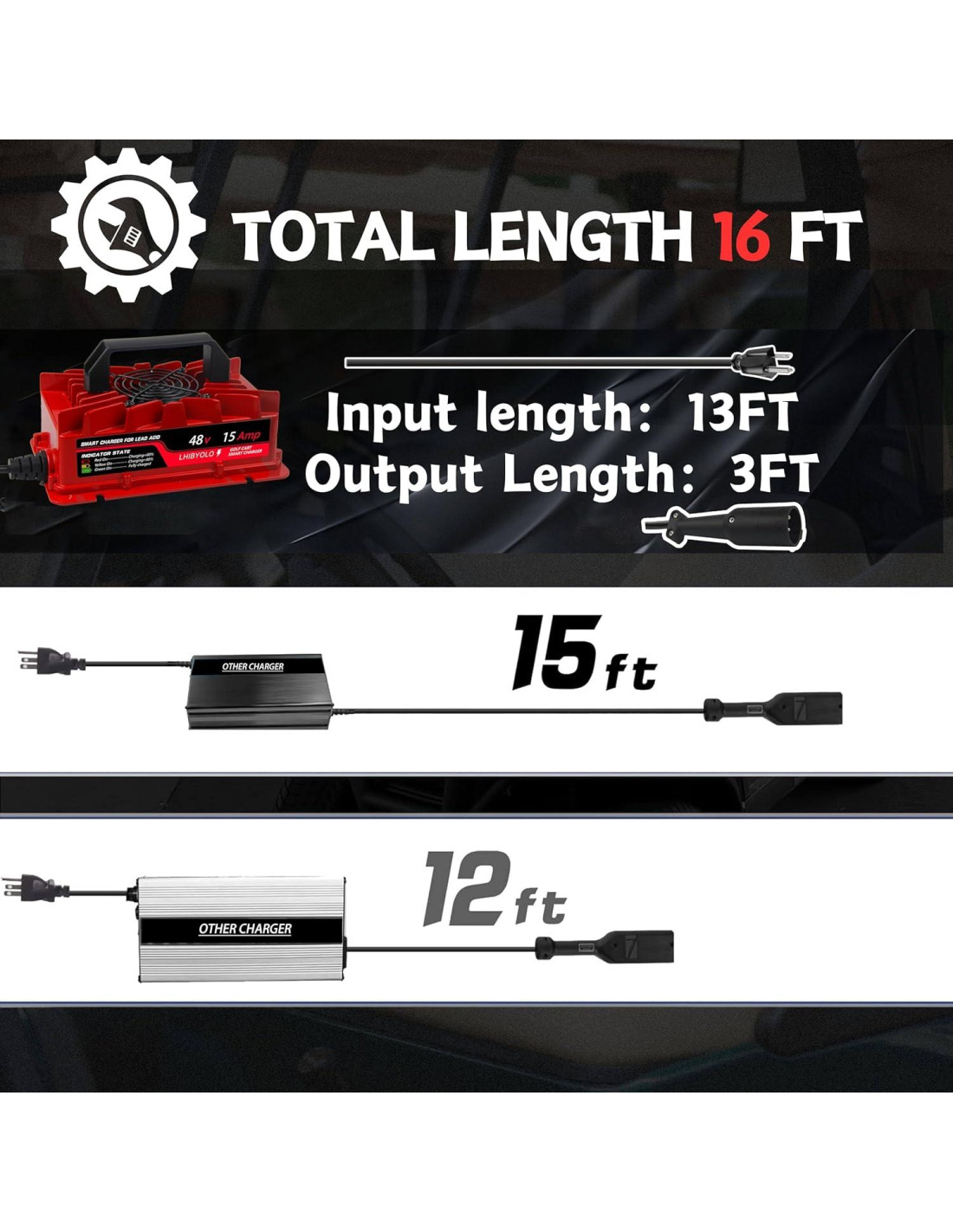 - Protección Inteligente para Tu Carrito: Prioriza la seguridad de tu carrito de golf con funciones de protección inteligente, desde protección contra bajo voltaje y sobrevoltaje hasta protección contra sobrecalentamiento, protección contra carga vacía, protección contra cortocircuitos/inversión y apagado automático cuando está completamente cargado. Ya sea en casa o en el club, la longitud del cable de 16 pies (4,88 m) se adapta a varios escenarios de estacionamiento.