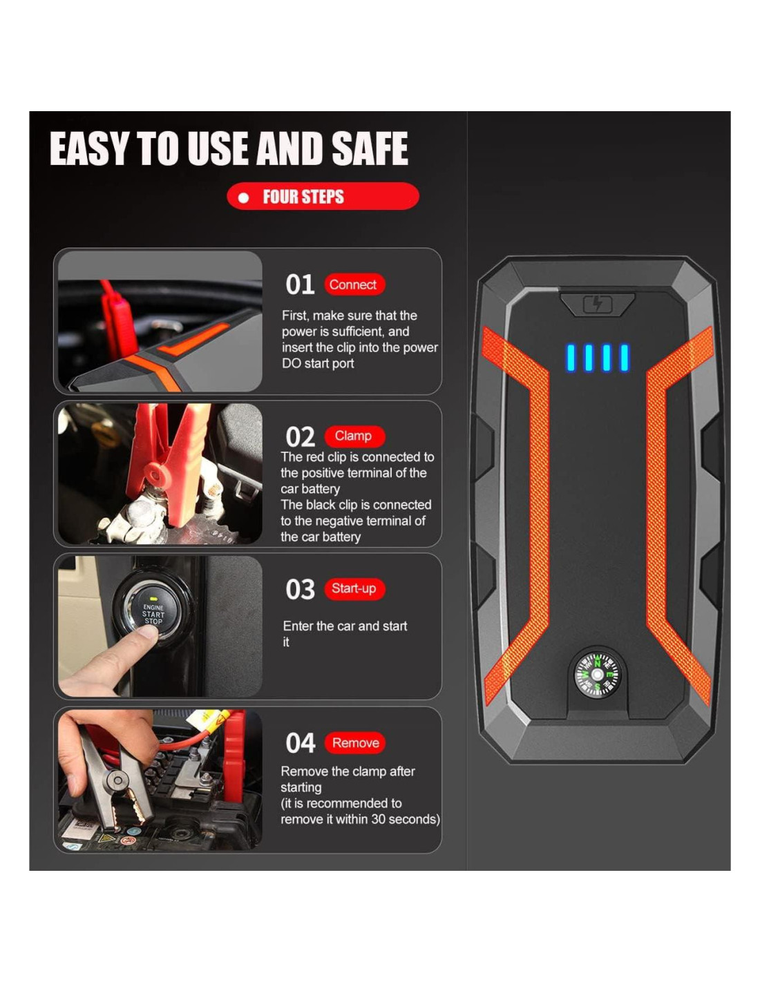 - [Protección Mejorada] - Esperamos que los usuarios se sientan 100% seguros al usar nuestro paquete de arrancador de batería. Por lo tanto, cada conjunto de arrancadores está equipado con clips mejorados que cuentan con 5 tipos de protección de seguridad, incluyendo prevención de cortocircuito, conexión inversa, prevención de sobredescarga, prevención de sobrecorriente, carga inversa.