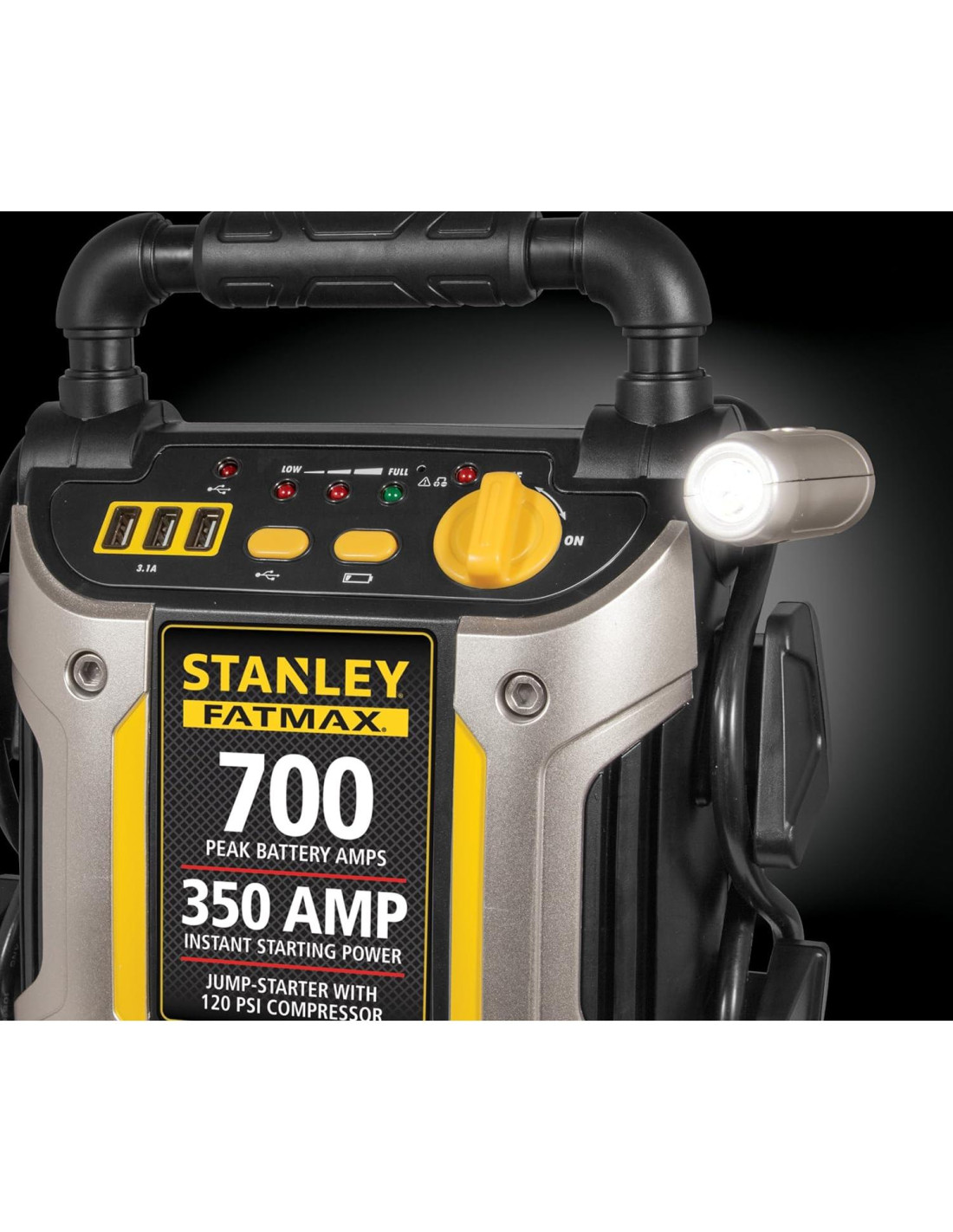 Con el arrancador y estación de energía STANLEY FATMAX J7CS, ya no necesitas temer a las emergencias en la carretera cuando tu vehículo no arranca. Este dispositivo compacto y portátil ofrece potencia de arranque con 700 amperios pico y 350 amperios de arranque instantáneo. Eso es suficiente potencia para arrancar tu coche, camión, SUV, motocicleta, barco, casa rodante, ATV o tractor; todo sin necesidad de usar otro vehículo para asistencia. Simplemente conecta las pinzas a la batería, enciende el interruptor y arranca tu vehículo. La alarma de polaridad inversa te alertará cuando haya una conexión incorrecta. Una luz LED de alta potencia rota 270 grados para ayudarte a trabajar en la oscuridad. Este arrancador está equipado con un compresor de aire de 120 PSI (8,27 bar) para ayudar a inflar neumáticos, equipos deportivos u otros artículos con baja presión. El puerto USB triple integrado es útil para cargar tu teléfono y dispositivos electrónicos. Cuenta con un cubo de carga integrado (un adaptador de carga de 120V) que permite que el arrancador STANLEY FATMAX J7CS se cargue utilizando un cable de extensión estándar, por lo que no necesitas llevar un cable de carga específico por separado. Cable de extensión se vende por separado. Para un rendimiento óptimo, la unidad debe cargarse cada 30 días cuando no esté en uso. Una vez utilizado, la unidad debe cargarse inmediatamente durante la noche.