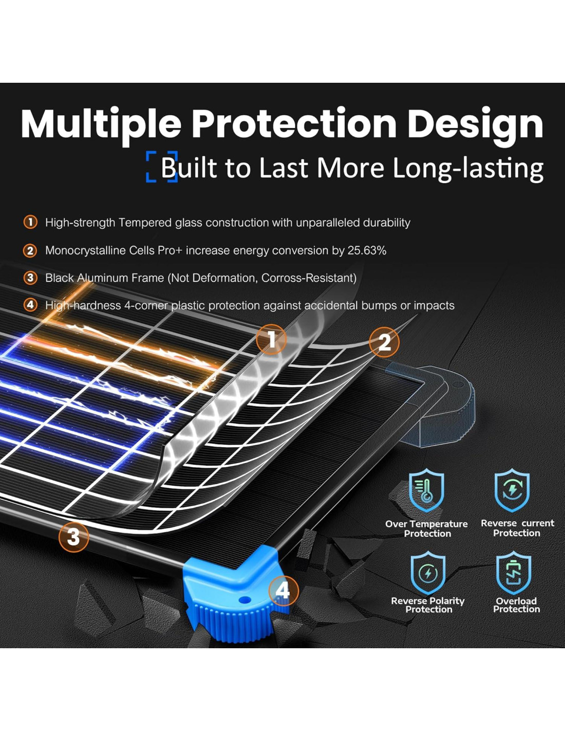 - Material de Calidad POWOXI: Esta celda mantenedora solar de 10W tiene una eficiencia de celda mejorada del 25.63% con tabletas de batería de silicio monocristalino de vidrio templado de alta resistencia que proporcionan alta eficiencia de conversión; extiende la vida útil de la batería y reduce la pérdida de corriente