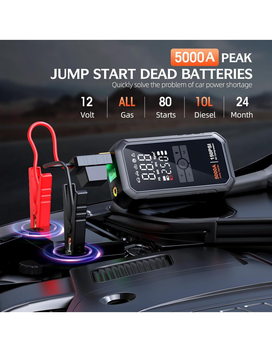- [ARRANQUE COMPLETAMENTE BATERÍAS MUERTAS] El arrancador de batería de coche tiene un inigualable 5000A y FUNCIÓN DE FUERZA DE ARRANQUE como doble salvaguarda, y puede arrancar instantáneamente tus vehículos varados (hasta todo gas/10L diésel) incluyendo baterías completamente descargadas o de bajo voltaje incluso a -20C a 60C. Cables de arranque duraderos y extendidos para alcanzar diversos terminales de batería. Espera durante aproximadamente 24 meses y soporta más de 1000 ciclos de recarga. Arranca el coche con confianza cada vez, lo cual es mucho más fácil que pedir ayuda a otro coche o servicio de carretera.