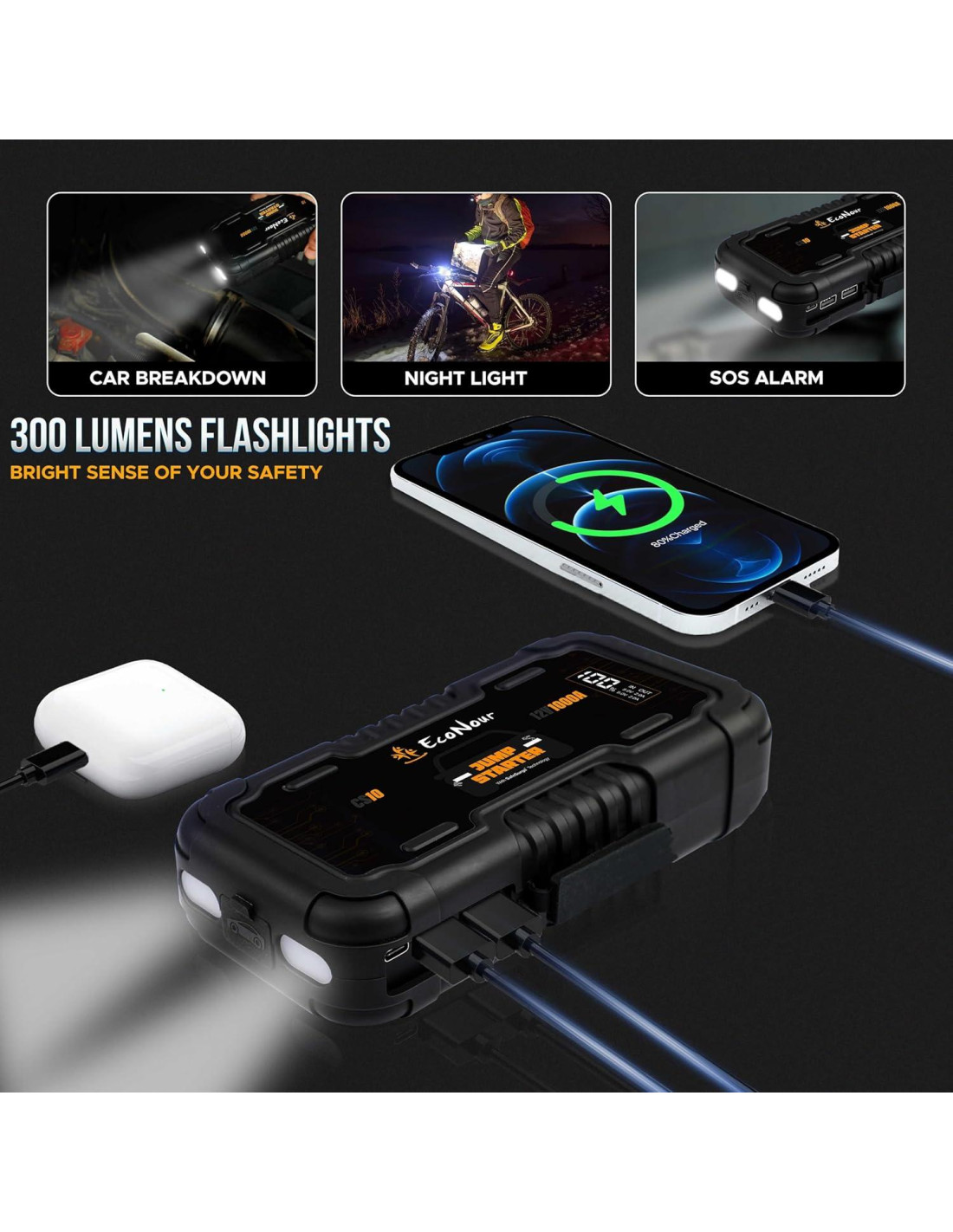 - Revive y Carga en Movimiento: No solo es un arrancador de coche portátil, este dispositivo también funciona como un banco de energía de 12000mAh con puertos USB Tipo-A duales para mantener tus gadgets funcionando. Ya sea un teléfono o una tableta, esta caja de salto para batería de coche portátil asegura que te mantengas alimentado. Un confiable cargador de batería de coche y paquete de arranque para uso durante todo el día.