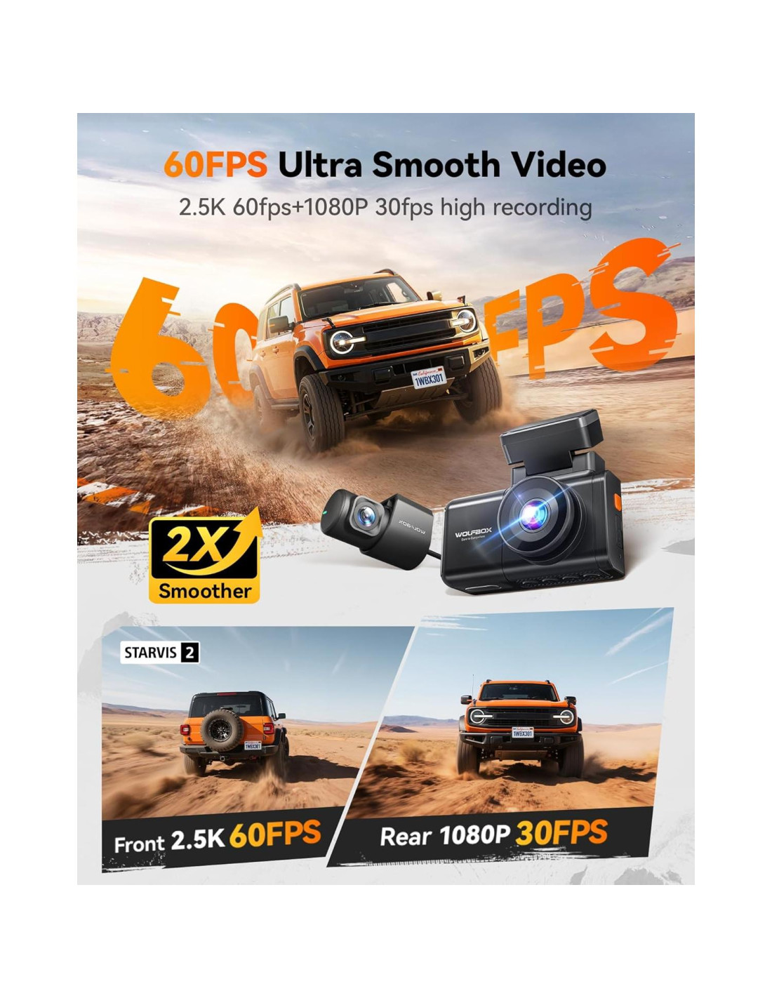 - [Cámara de Salida Doble 2.5K 60fps+1080P 30fps] La cámara de salpicadero WOLFBOX X3 para automóviles ofrece una resolución ultra suave de 2.5K(2560*1440P) 60fps en la parte delantera y 1080P 30fps en la parte trasera para capturar con precisión matrículas y detalles finos. La cámara frontal cuenta con el sensor STARVIS 2 IMX675, que reduce el ruido de imagen y el desenfoque de movimiento para ofrecer imágenes nítidas incluso en condiciones de poca luz