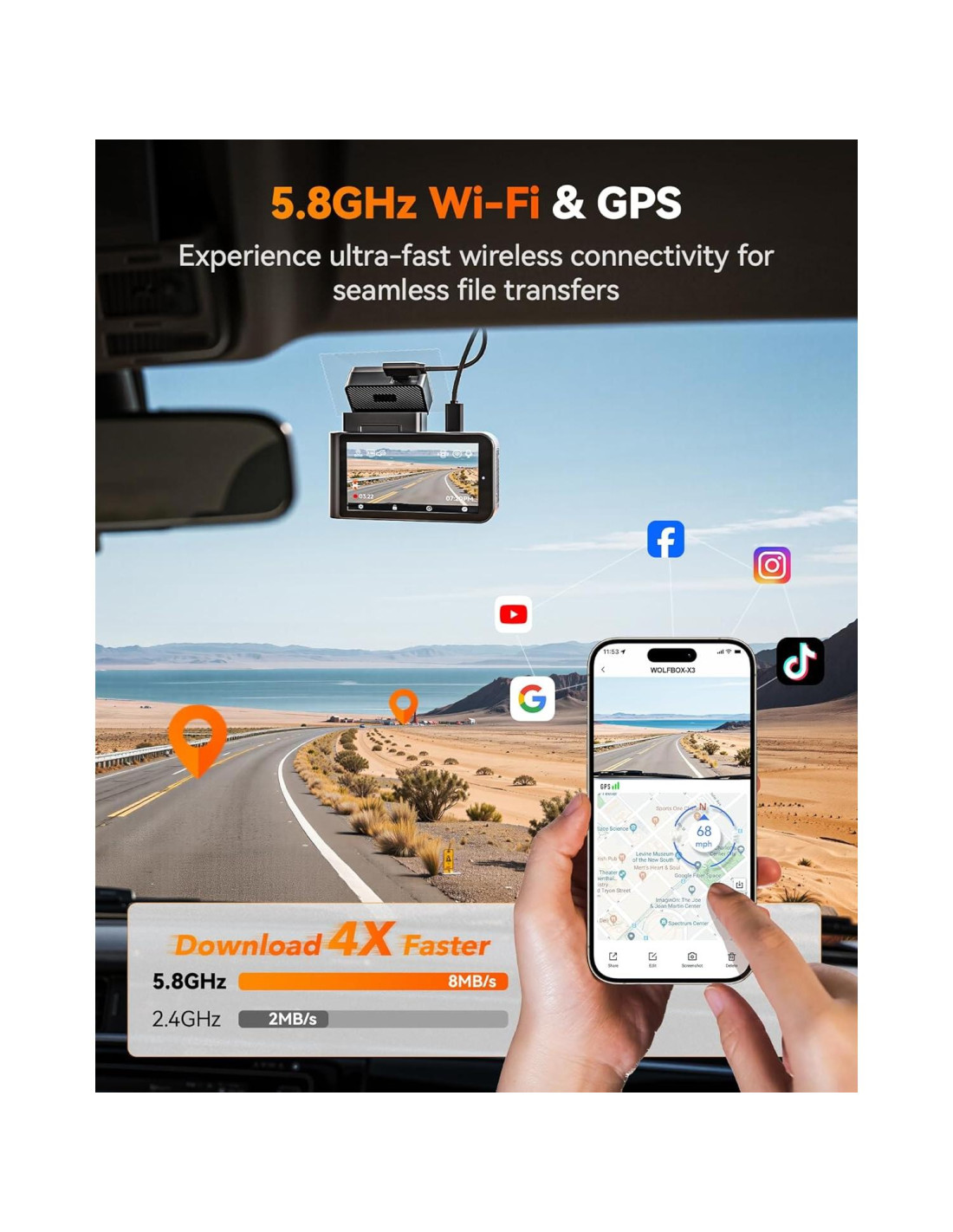 - [Wi-Fi de 5.8GHz y GPS] Conecte la cámara de salpicadero X3 a través de Wi-Fi de 5.8GHz para transferencias de video más rápidas y estables a la aplicación WOLFBOX - previsualice el metraje, descargue clips sin problemas o comparta videos. El GPS incorporado registra con precisión la velocidad y ubicación del vehículo, incrustando todos los datos del viaje directamente en los archivos de video como evidencia irrefutable