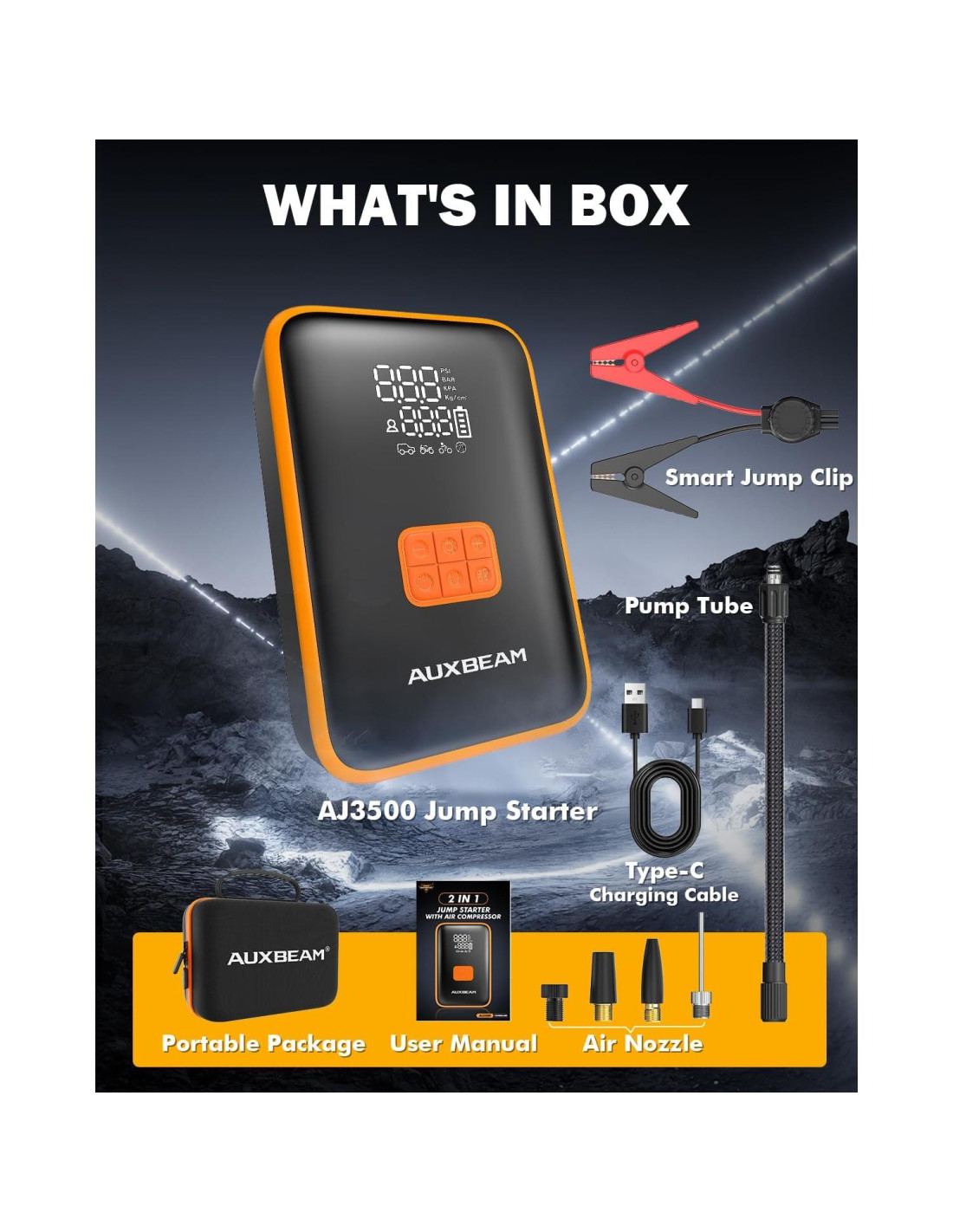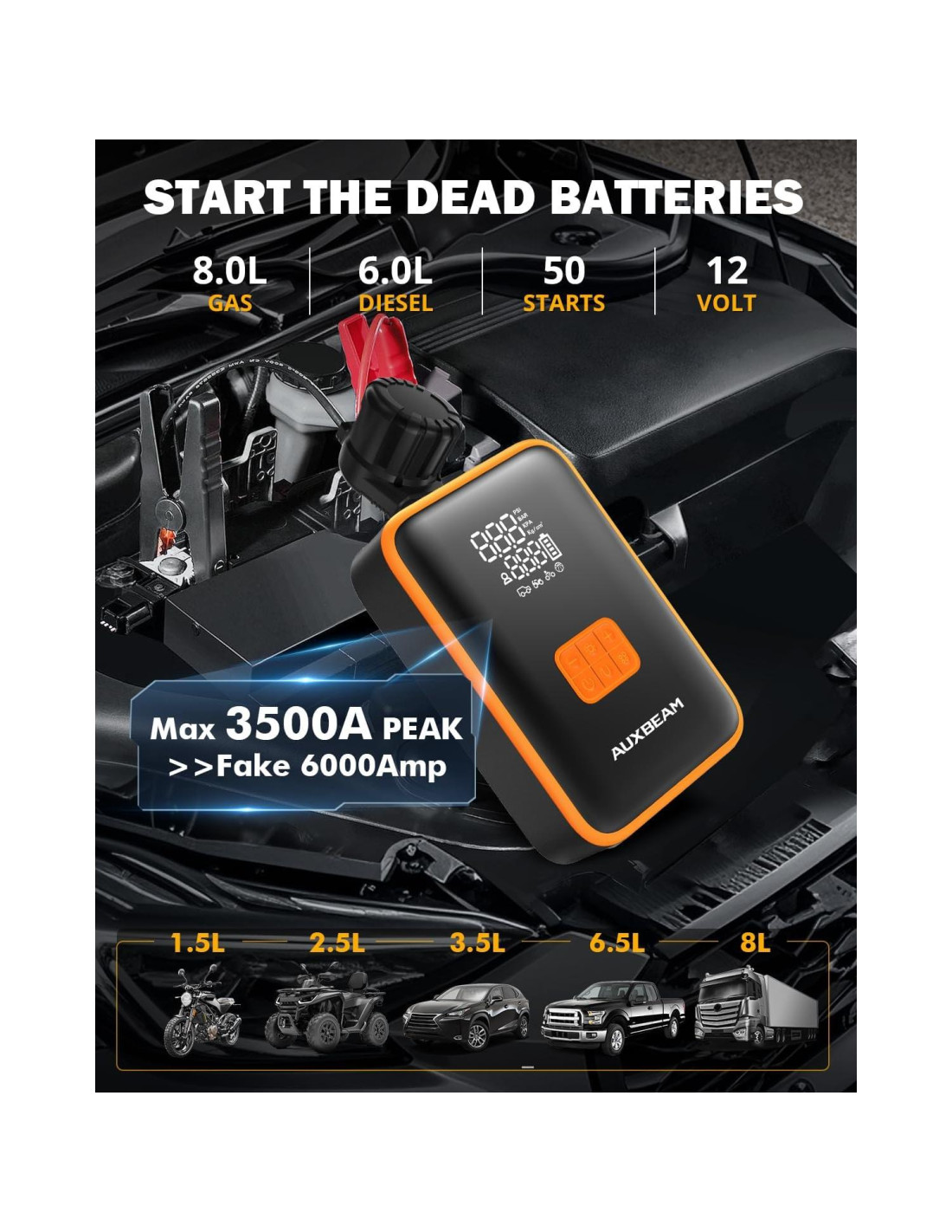 - Ultra-Poderoso Arranque en Invierno: Este arrancador de batería de coche utiliza tecnología de vanguardia LiPo de 40C para entregar 3500A de corriente y revivir una batería muerta en segundos-hasta 20 veces por carga. Diseñado para enfrentar temperaturas bajo cero (-20C a 60C), es tu solución para coches en apuros helados. ¡No más momentos de 'oh-oh' en invierno!