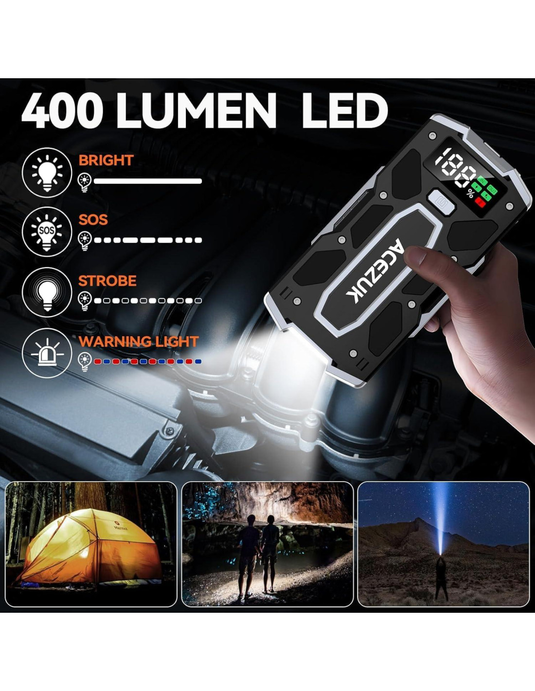 - BANCO DE ENERGÍA PORTÁTIL - El arrancador de litio ACEZUK está integrado con 3 funciones. Es un arrancador de coche, banco de energía portátil, brújula, linterna de emergencia LED con 4 modos (Linterna, Estroboscópico, SOS, Advertencia). Está equipado con 2 puertos.