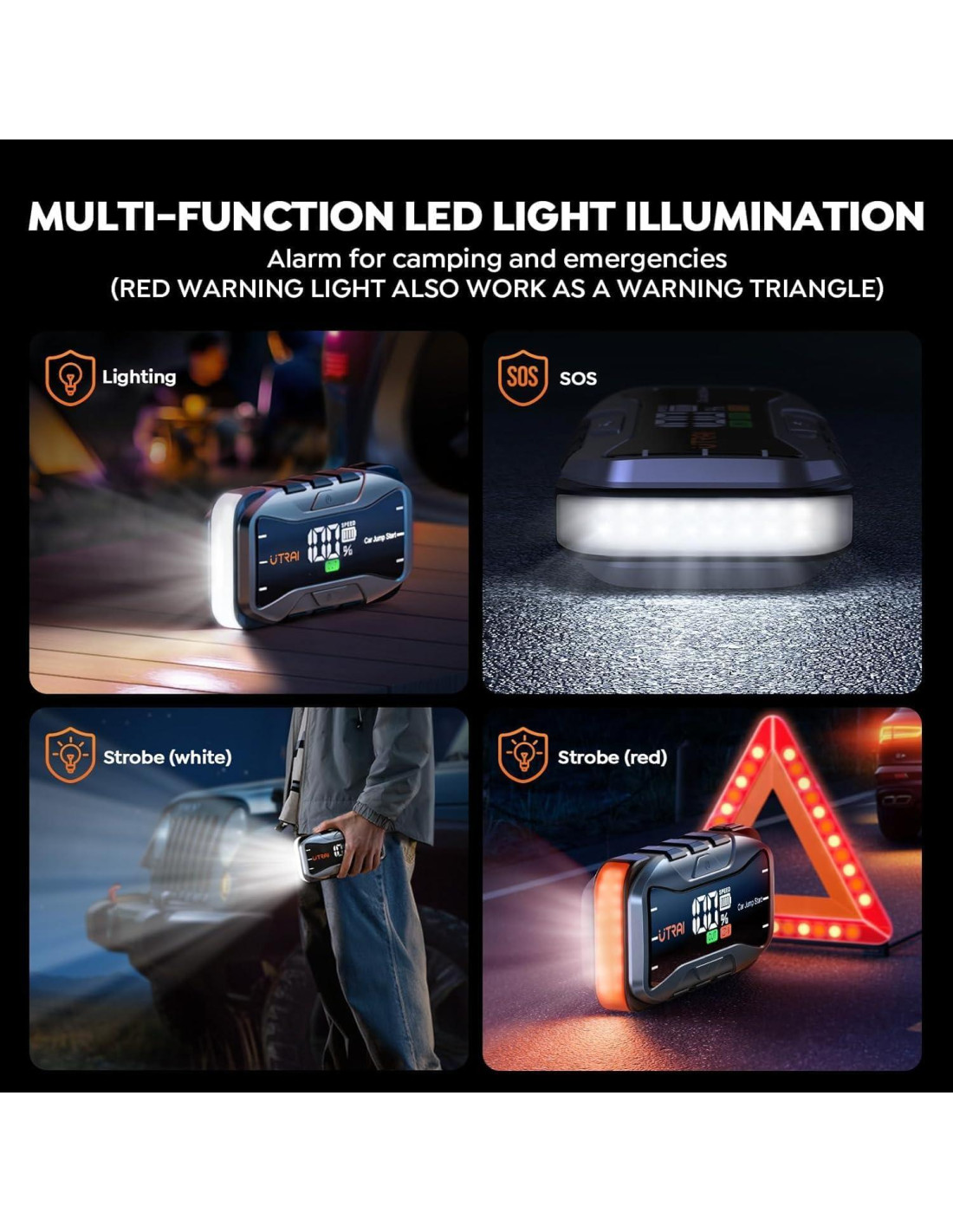 - ARRANCADOR MULTIFUNCIONAL 9 EN 1: El nuevo modelo JS-10 de UTRAI no solo es un arrancador portátil, sino también una estación de energía para bomba de neumáticos, medidor de voltaje, banco de energía portátil, carga rápida PD65W, kit de herramientas de emergencia con una práctica linterna LED de 600 lúmenes de 4 modos (foco, SOS, estroboscópico, destello), incluyendo el estroboscópico rojo personalizado como una luz de triángulo de advertencia para prevenir accidentes al estacionar en carreteras y autopistas públicas, 48 horas de iluminación constante aseguran que puedas lidiar con cualquier avería de tu coche por la noche.