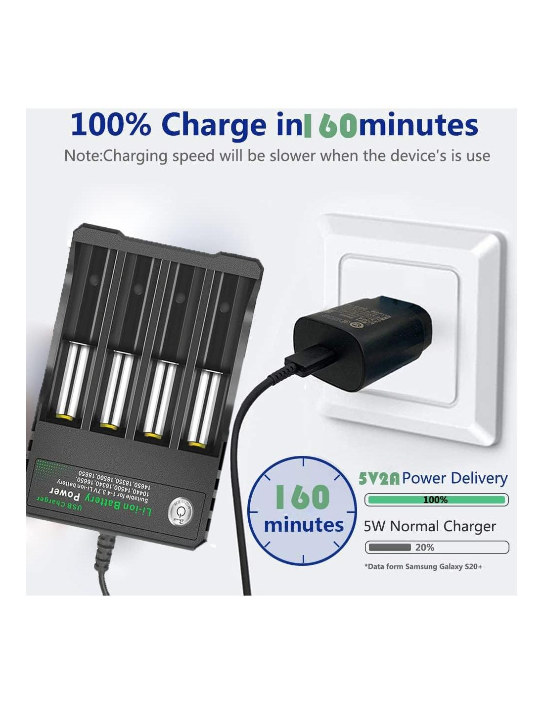 Indicador LED, cable de carga USB, protección de seguridad, conveniente y práctico, es una opción ideal para viajar y trabajar. 1. El indicador LED y la ranura de la batería están controlados y monitoreados de forma independiente. Puedes verificar todo el estado de carga de un vistazo sin preocuparte por la sobrecarga. 2. Cable de carga USB, puedes cargarlo en cualquier lugar conectándolo a una fuente de energía (como un adaptador, batería móvil). 3. Un lado del electrodo adopta una estructura retráctil de resorte, que puede cargar dos baterías al mismo tiempo, y es adecuado para 10440/14500/16340/17670/18350/18500/18650 y otras baterías recargables de 3.7V. (No soporta batería 26650) 4. Con protección contra polaridad inversa, sobrevoltaje, sobrecorriente, sobrecalentamiento, sobrecarga, sobredescarga, protección contra cortocircuitos. Tamaño del cargador: 13.0 x 9.0 x 3.0 cm (5.12 x 3.56 x 1.2 in) Entrada del cargador: DC 5V 2000mAh Salida del cargador: DC 4.2V 500mAh x 4 Carga Ultra Rápida Hasta 500mA de corriente de carga en cada ranura (cuando la entrada es de 2A), acorta considerablemente tu tiempo de espera. El LED te muestra el estado de carga y el nivel de carga de cada batería. Carga Segura: Un microprocesador controla el proceso de carga, se detiene automáticamente cuando está completamente cargado. Además, cuenta con protección contra polaridad inversa y protección contra cortocircuitos. Todas estas características de seguridad integradas garantizan tu seguridad y la salud de la batería. 1 x Cargador Universal USB 1 x Manual de usuario en inglés. - Capaz de cargar 4 baterías de 3.7V simultáneamente - Detecta automáticamente el estado de la batería y selecciona el voltaje y modo de carga apropiados. - Se detiene automáticamente cuando está completo. - Excelente característica