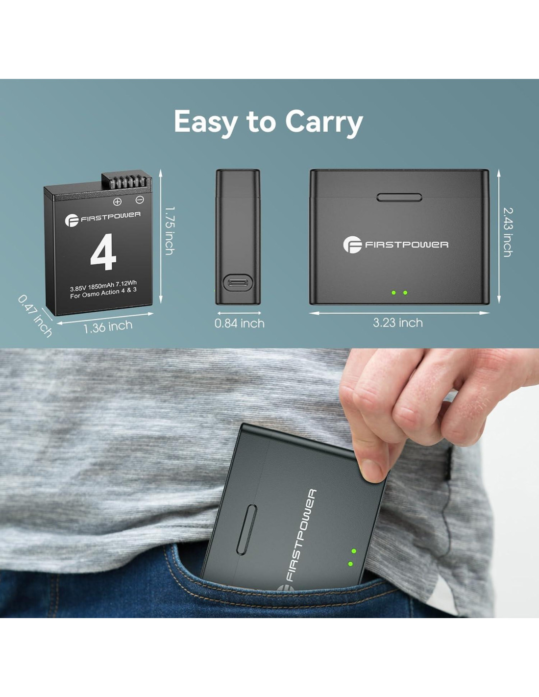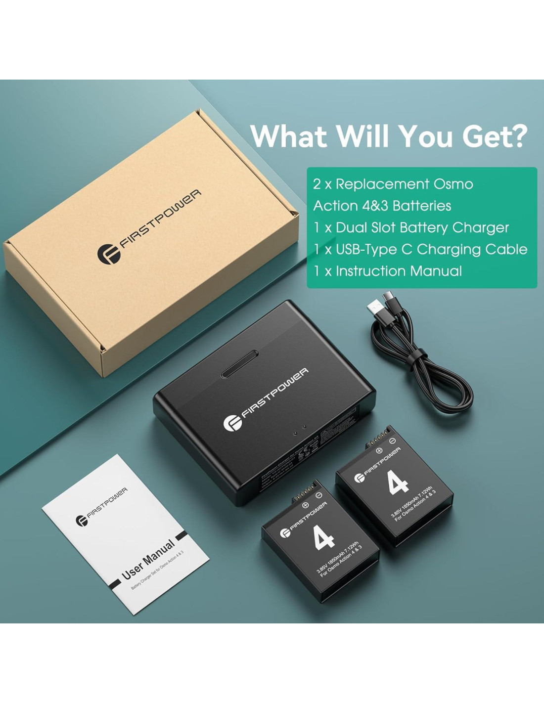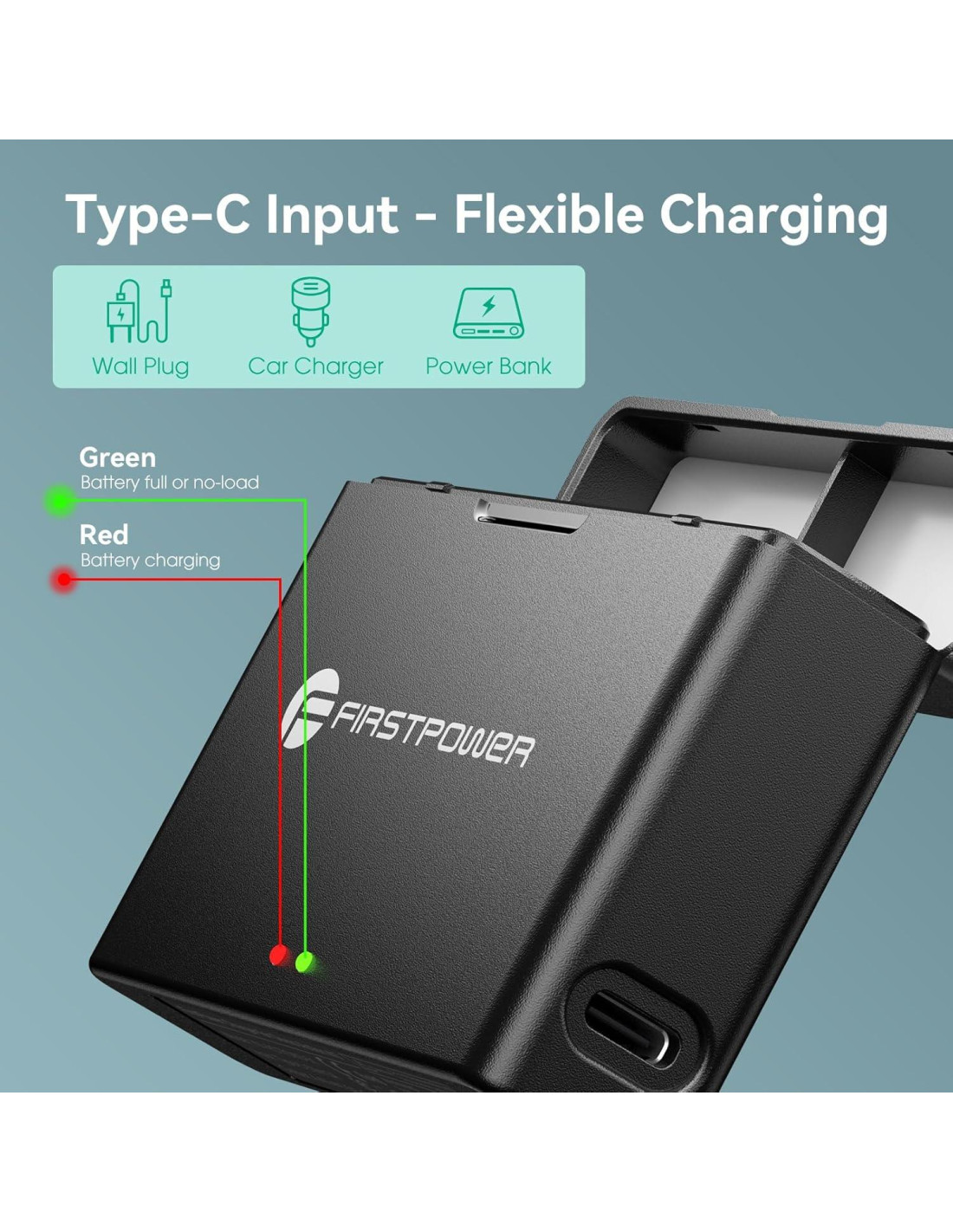 Apariencia exquisita y diseño ligero que facilita llevarlo en el bolsillo o la bolsa, listo para cargar sobre la marcha. Cargador de doble ranura con puerto Type-C para carga versátil utilizando dispositivos USB 5V/3A como bancos de energía, laptops, cargadores de coche o tomacorrientes. Cada ranura del cargador tiene un indicador LED separado: luz roja para carga, luz verde para carga completa o estado sin carga. 2 x 1850mAh Batería de Reemplazo para DJI Osmo Action 4/3; 1 x Cargador Rápido de Doble Ranura; 1 x Cable de Carga USB-C. Batería para Action 4/3. Batería para GoPro 13. Batería para Insta360 X4. Batería para GoPro 9-12. Batería para Insta360 Ace. 1. ¡FirstPower es de primera categoría en términos de compatibilidad, calidad, materiales, certificación y servicio postventa! 2. Todos los productos de FirstPower son probados por los fabricantes para igualar los productos OEM y se exportan a todo el mundo. 3. Estamos comprometidos a satisfacer todas las necesidades de los clientes. Escuchamos sus sugerencias y agradecemos su apoyo.