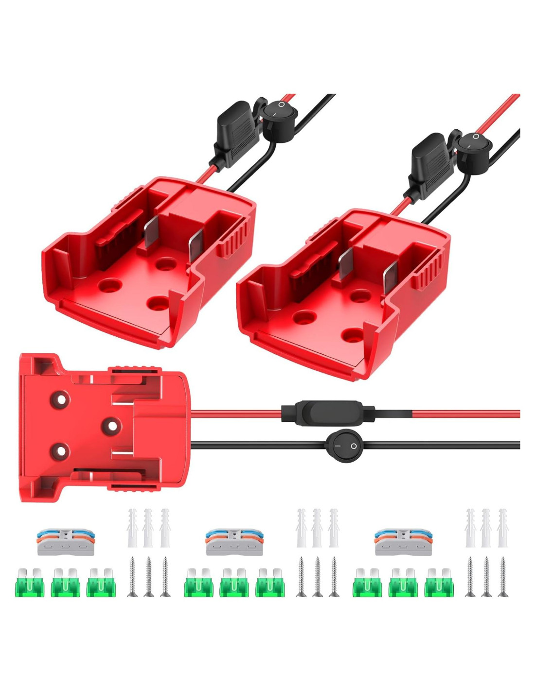 Adaptador de batería para power wheel compatible con baterías de 18 voltios Li-ion Milwaukee M18 (48-11-1815 / 48-11-1820 / 48-11-1828 / 48-11-1840 / 48-11-1850 / 48-11-1860, etc.) Nuestro adaptador está bien hecho, se ajusta perfectamente a su batería, instala y bloquea su batería fácilmente. Hemos mejorado el dispositivo de protección de línea del adaptador de batería. El interruptor añadido asegura que pueda encender y apagar la batería fácilmente, equipado con un fusible de 30Amp que protege los dispositivos de batería de daños por sobrecarga, la tapa de goma del portafusible se ajusta firmemente para proteger el fusible de cuchilla en su interior. Además, hemos equipado terminales de cable, conveniente para que conecte el cable de alimentación del dispositivo con el cable de alimentación del adaptador de manera más rápida y mejor. El cable de cobre de silicona, resistente al calor, el cable de 12 AWG es adecuado para aplicaciones de alta potencia, corriente máxima permisible de 20A, proporciona suficiente energía para actualizar sus herramientas eléctricas, juguetes de montar, luces de trabajo o robótica DIY. Le permitirá actualizar rápidamente y de forma segura su power wheel, disfrutar de la belleza del DIY en su tiempo libre o cuando esté acompañando a sus hijos. El nuevo adaptador de power wheel está hecho de plástico ABS, moldeado por inyección, excelente resistencia a arañazos y golpes, resistencia química y es impermeable al calor, humedad y corrosión, adecuado para uso en interiores y exteriores. Contenido del paquete: 3 x adaptador de power wheel, 9 x fusibles de 30Amp, 3 x terminales de cable, 9 x sujetadores de tornillo. Nota: 1. Este convertidor no es un cargador, solo emite el voltaje y la potencia directamente de su batería. 2. El cable rojo está conectado al terminal positivo, el cable negro está conectado al terminal negativo. Al usar, los dos cables no deben estar en contacto. 3. Si no se usa durante mucho tiempo, asegúrese de quitar la batería del adaptador.