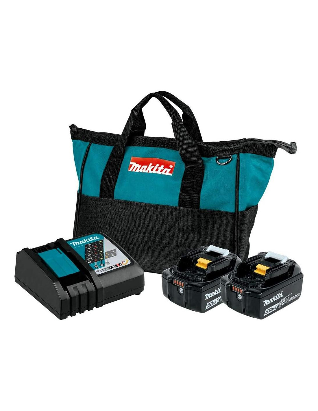 Construye tu propio Kit de Herramientas Makita con el Paquete de Inicio de Batería de Litio-Ion 18V LXT y Cargador Rápido Óptimo (5.0Ah). Makita ofrece muchas herramientas inalámbricas disponibles como "herramientas desnudas" (solo herramienta, sin baterías ni cargador incluidos). Adquiere el Paquete de Inicio, luego compra las "herramientas desnudas" de 18V que necesitas para realizar el trabajo, incluyendo productos 18V X2 LXT alimentados por dos baterías de litio-ion de 18V. Es una forma ideal de comenzar a construir un Sistema de Herramientas Inalámbricas Makita. Las Baterías de Litio-Ion de 18V de Makita resisten la autodescarga, por lo que están listas para usar incluso después de largos períodos de almacenamiento. El Cargador Rápido Óptimo es un sistema de carga inteligente que se comunica con la batería durante la carga para monitorear la corriente, el voltaje y la temperatura. Esta tecnología de carga avanzada ayuda a optimizar la vida útil de la batería y proporciona una carga más rápida. El Cargador Rápido Óptimo de 18V (DC18RC) ofrece a los usuarios de herramientas una eficiencia de carga inigualable, de modo que sus baterías pasan más tiempo trabajando y menos tiempo en el cargador. Para mejorar el rendimiento de la herramienta y extender la vida útil de la batería, Makita creó los Controles de Computadora de Protección Star. Star Protection es una tecnología de comunicación que permite a la herramienta y la batería intercambiar datos en tiempo real y monitorear las condiciones durante el uso para proteger contra sobrecargas, sobredescargas y sobrecalentamiento. Makita, el líder en innovación en tecnología de herramientas inalámbricas, tiene el sistema de herramientas inalámbricas más grande del mundo alimentado por baterías de litio-ion de estilo deslizante de 18V.