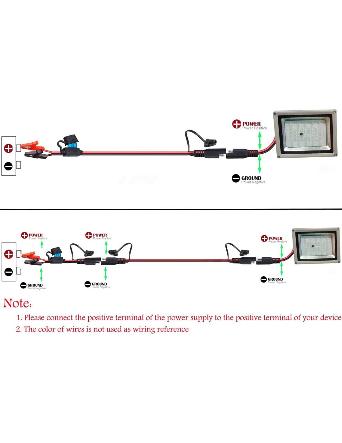 - Especificación: Pinzas de cocodrilo con cable de 10AWG, 2 pies (0.61 metros) de largo, con fusible de 15A para protección eléctrica; rápido y fácil de conectar y desconectar.