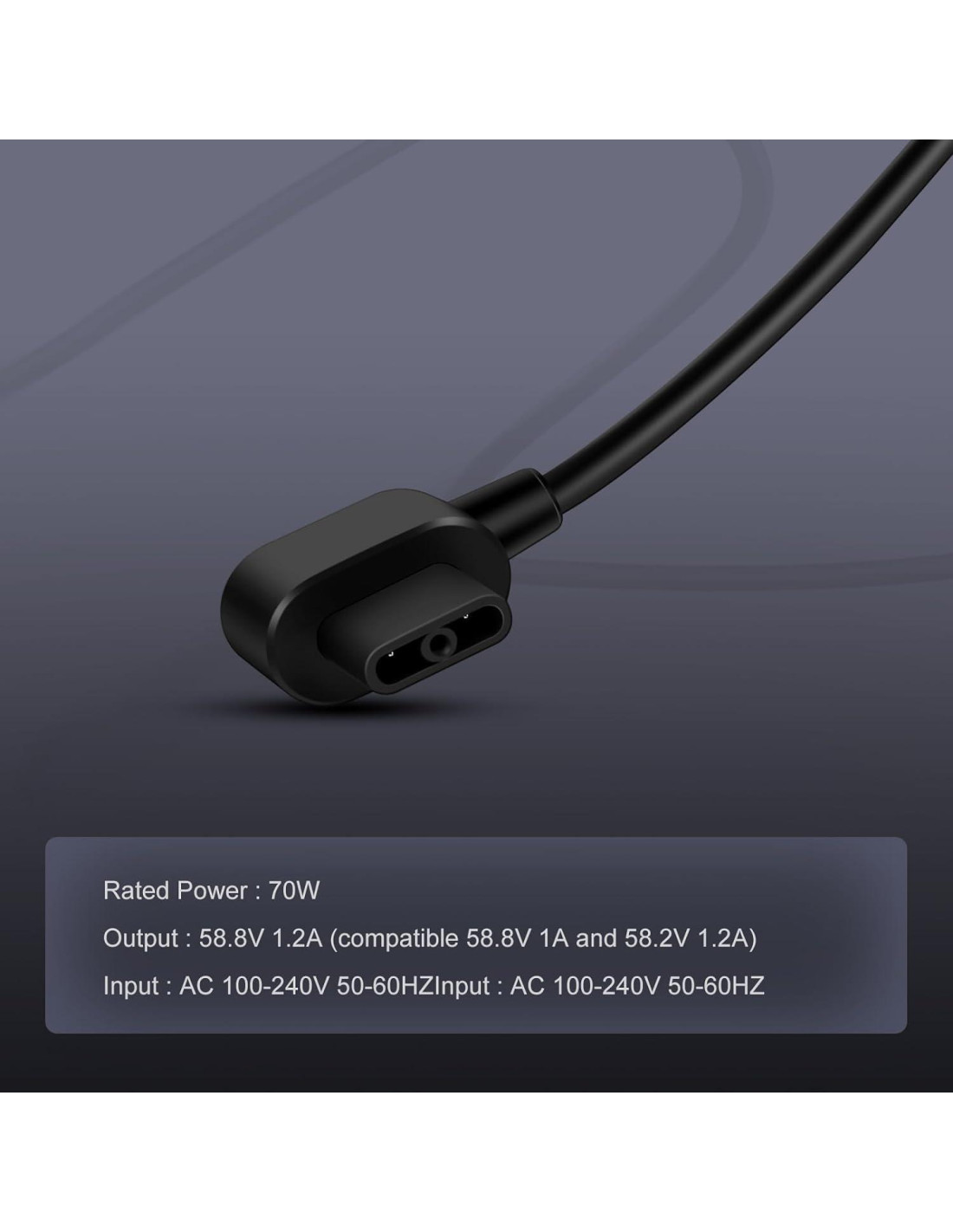 - Salida: 58.8V 1.2A (compatible con 58.8V 1A y 58.2V 1.2A); Entrada: AC 100-240V 50-60HZ; Potencia nominal: 70W;