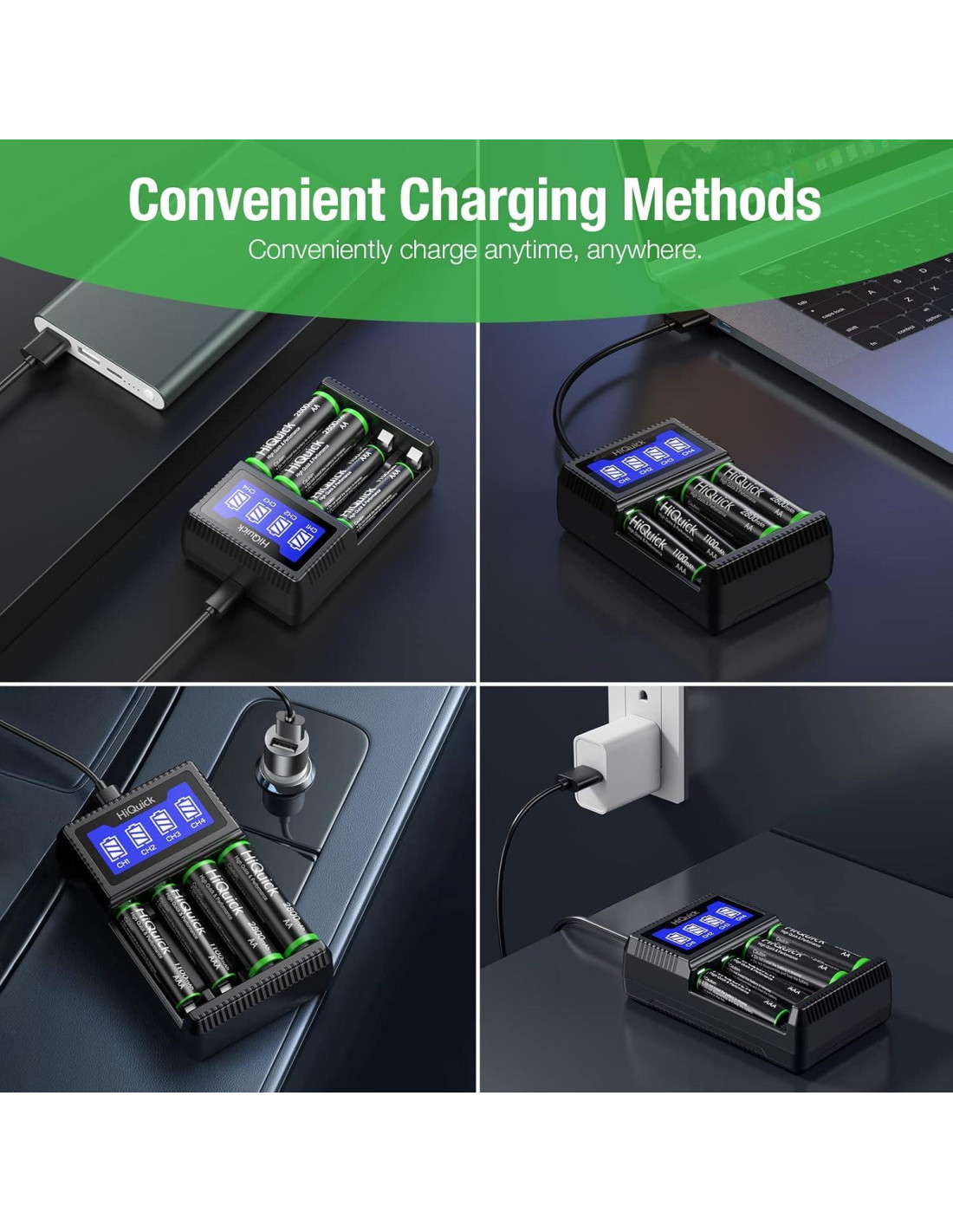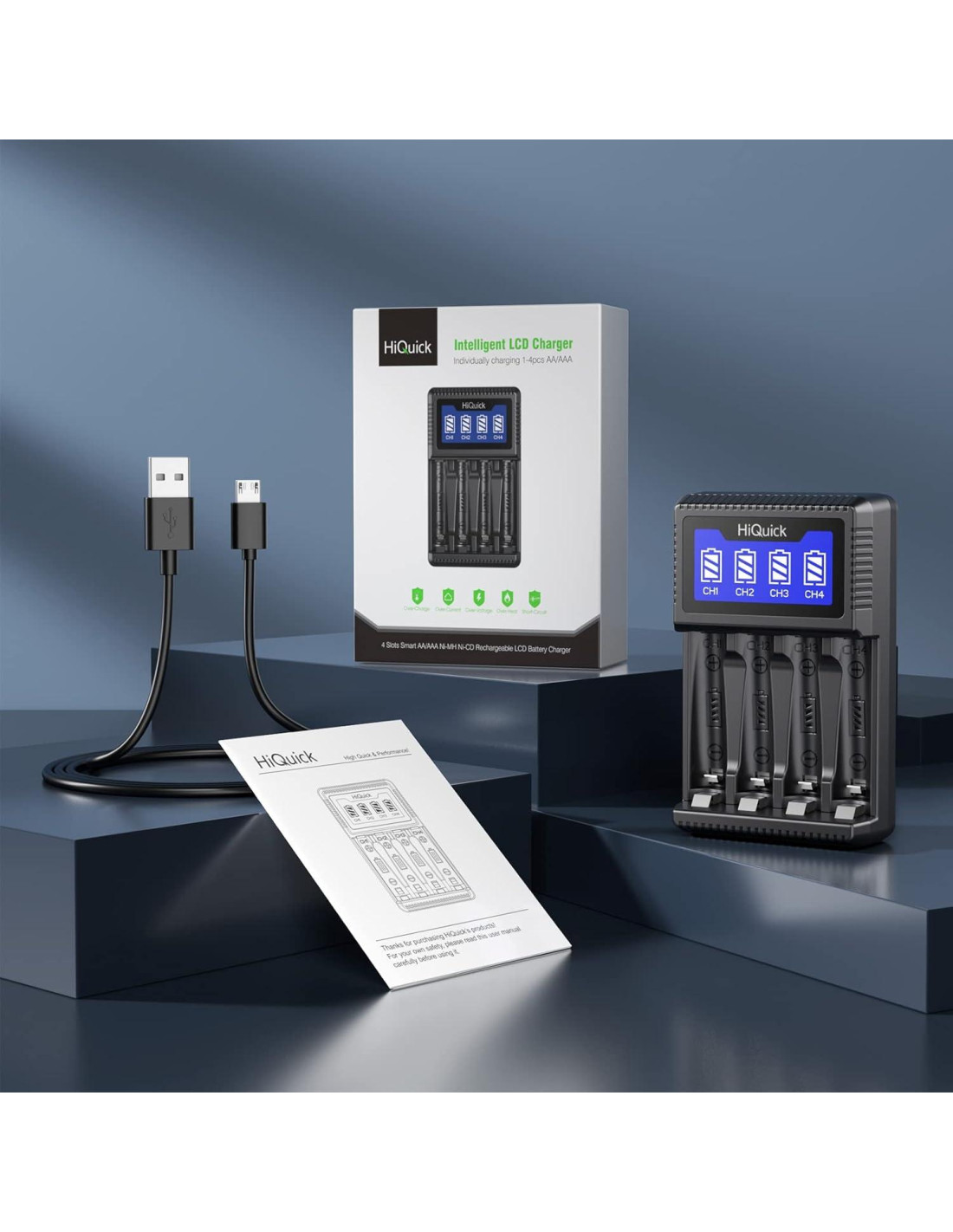 - Ranuras de Carga Independientes: El Cargador de Baterías Recargables HiQuick de 4 Bahías permite 4 ranuras de carga independientes y puede cargar de forma independiente de 1 a 4 baterías recargables AA/AAA Ni-MH/Ni-CD.
