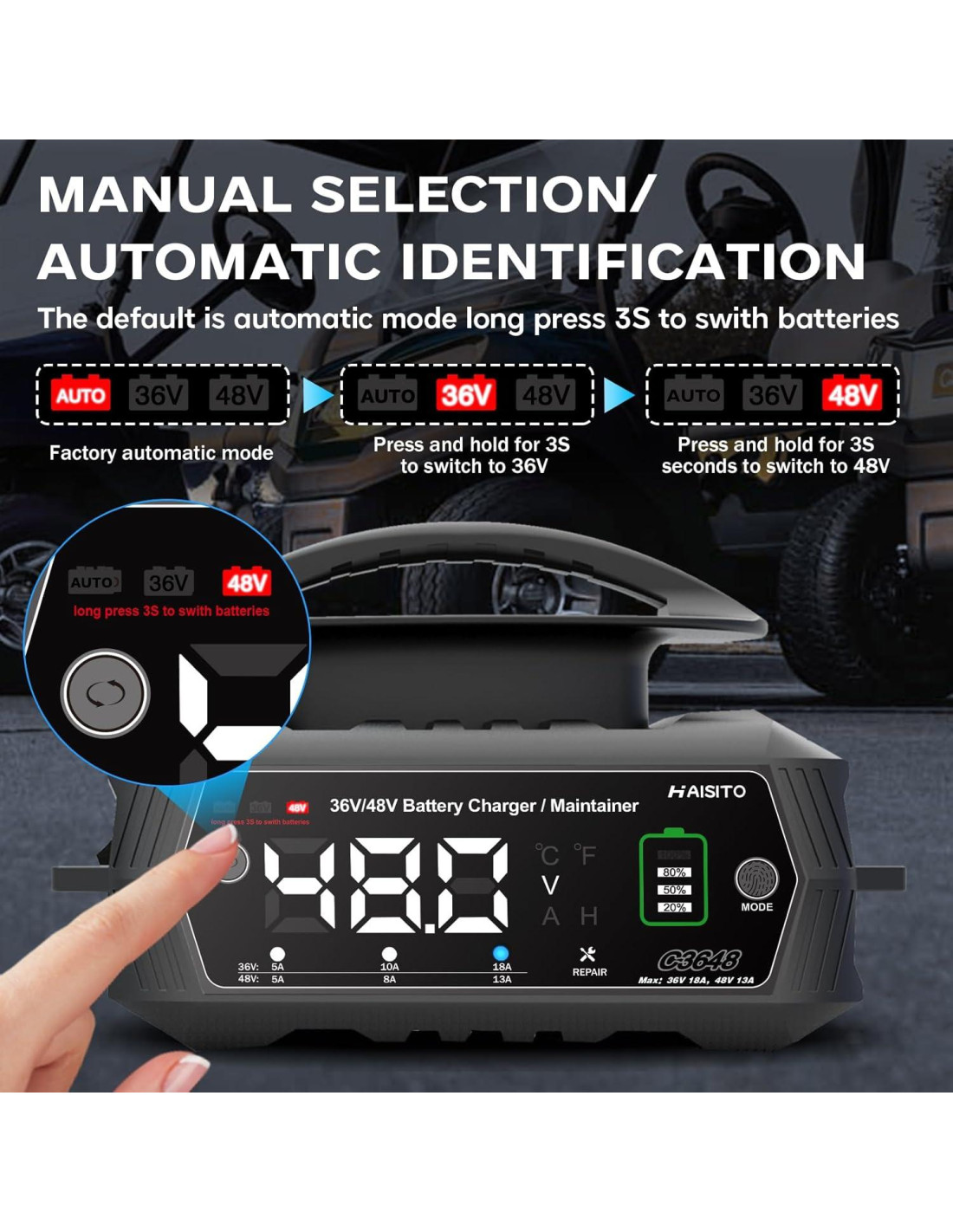 - [Protección y Mantenimiento] Cargador inteligente rápido de 9 niveles, compensación de temperatura, sistema de enfriamiento, sobrecorriente, sobrevoltaje, protección contra cortocircuitos y conexión inversa, sin chispa, material refractario, múltiples protecciones, seguro y confiable. Voltaje de entrada: 100-240V 50/60Hz, Voltaje/corriente de salida máxima: 36V 18A, 48 V 13A. Voltaje de inicio mínimo: 26V. Ajusta automáticamente e inteligentemente la corriente de carga para prolongar la vida de la batería. No puede activar una batería agotada.