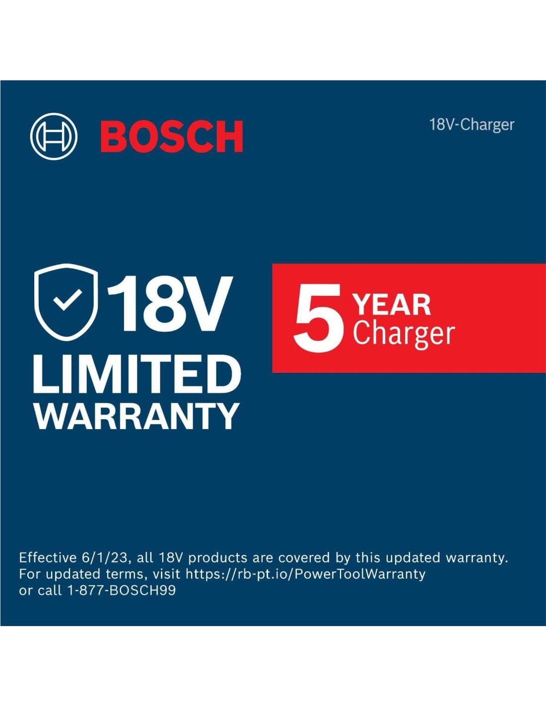 - Descripción de la garantía: Los cargadores Bosch de 18V están cubiertos por una garantía limitada de cinco años. Para más información, visite el sitio web del fabricante