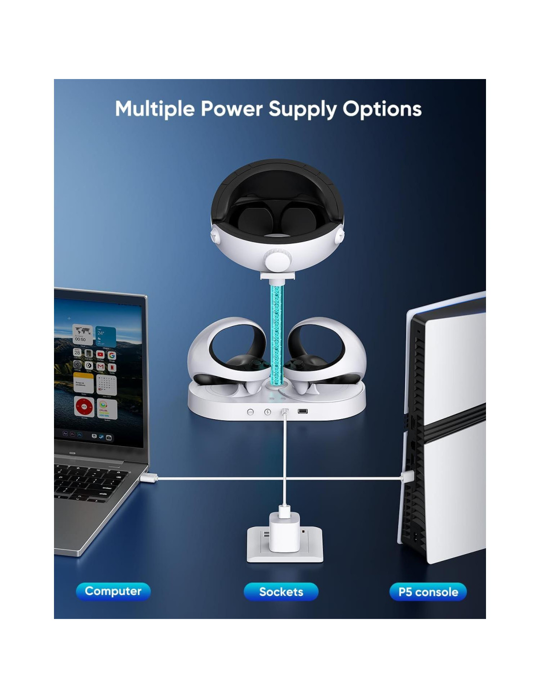 - [Consola PS5 o Fuente de Alimentación 5V/2A] Alimentado por USB, la estación de carga para el controlador Sense de PS VR2 utiliza la consola PS5 (muy recomendada) o un adaptador de 5V/2A como fuente de energía. No ocupará el puerto USB de la consola PS5 ya que ofrecemos un USB de salida adicional para transferir datos o cargar si es necesario. (Nota: Usar un adaptador de 1A puede hacer que la estación de carga funcione de manera imperfecta debido a la insuficiencia de corriente de entrada).