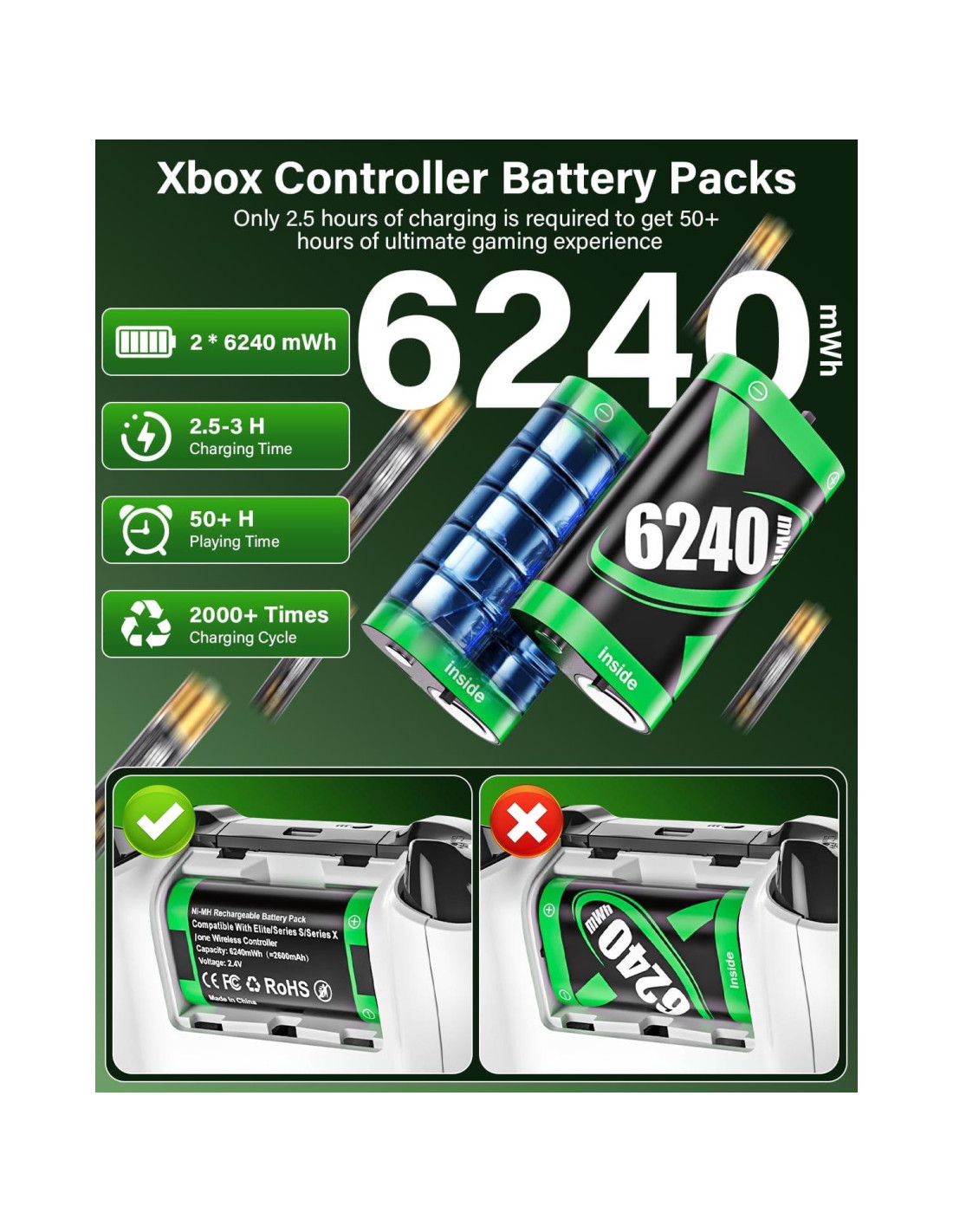 - 2 x 6240mWh Paquete de Batería para Controlador Xbox con Cargador: El paquete de batería recargable ZRZLMVP para Xbox viene con 2 x 6240mWh de capacidad ultra grande y un cargador rápido para controlador Xbox y un cable Type-C (40 inches (101,6 cm)). Este paquete de batería recargable para Xbox es compatible con Xbox Series S/Xbox Series X/Xbox One/Xbox One S/Xbox One X/Xbox One Elite Controlador Inalámbrico. Las baterías recargables ZRZLMVP para controlador Xbox con cargador son el mejor kit de accesorios para jugar y cargar para jugadores de Xbox.