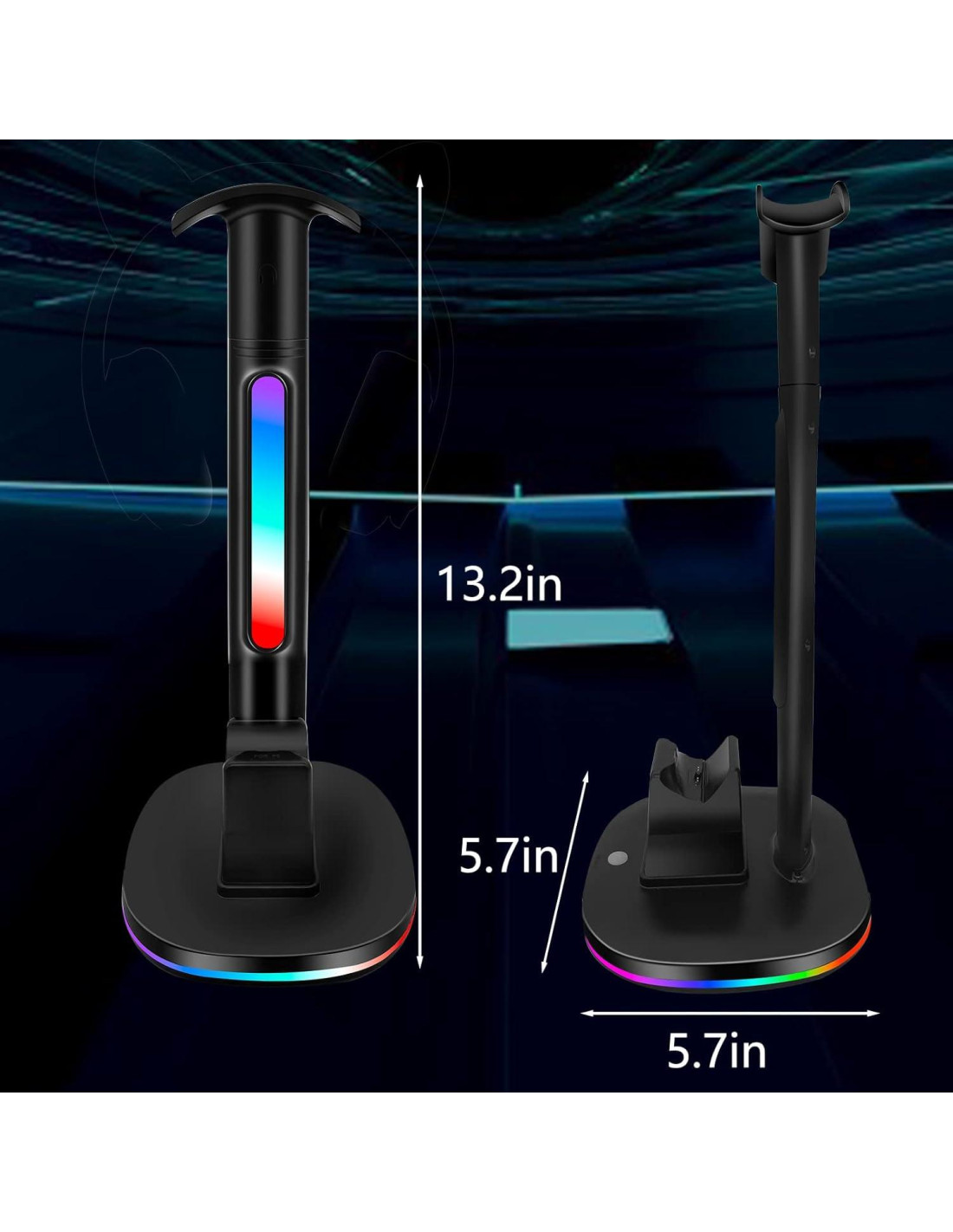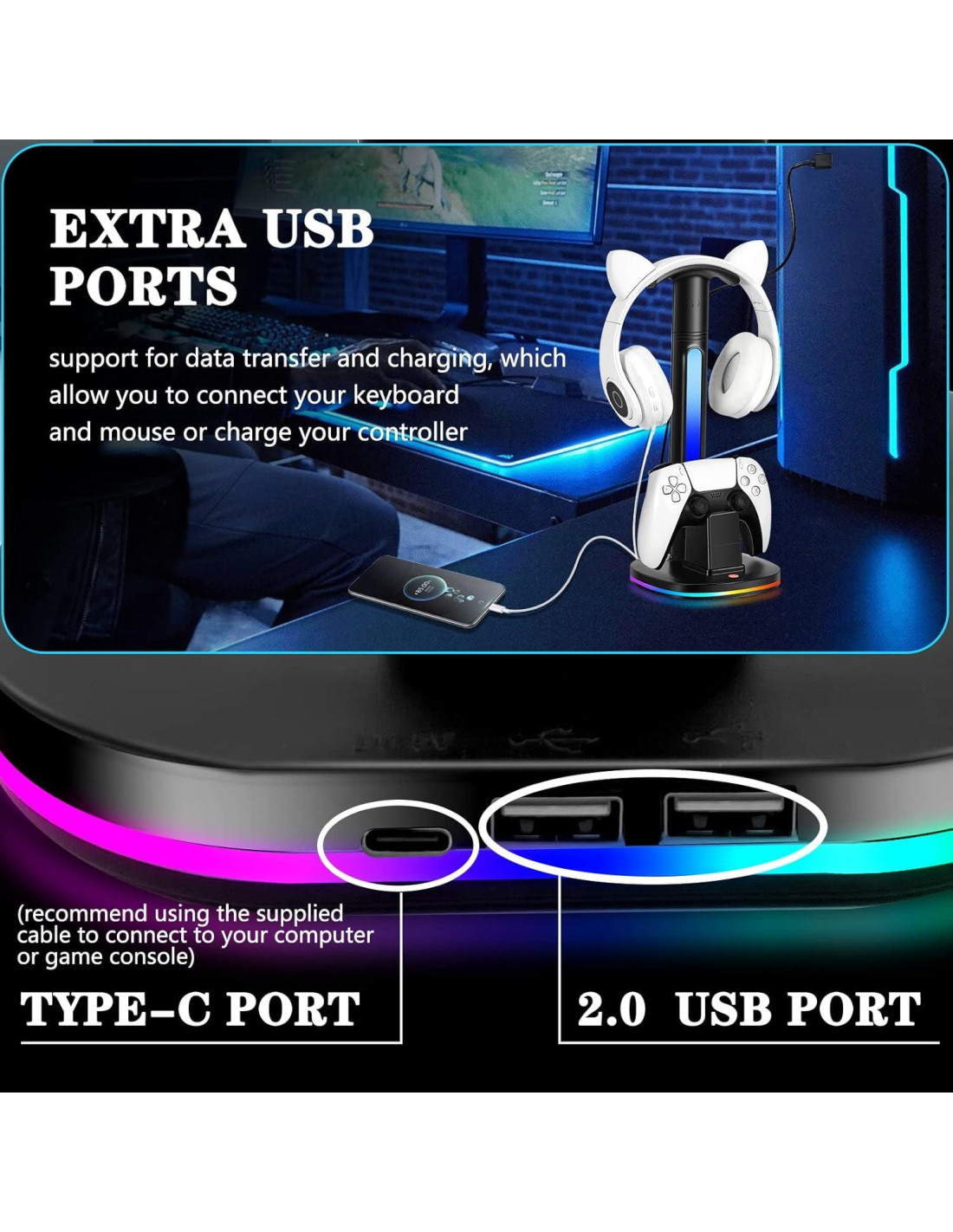 - Soporte para Controlador y Auriculares: merece un espacio de juego ordenado y conveniente. Nuestra estación de carga para controlador PS5 con soporte para auriculares puede cargar su auricular mientras está almacenado, el controlador también puede colocarse en la base de carga para cargar, y la luz RGB proporciona la ambientación de juego para usted y el puerto USB adicional le permite conectar su ratón y teclado, o cargar otros dispositivos electrónicos.