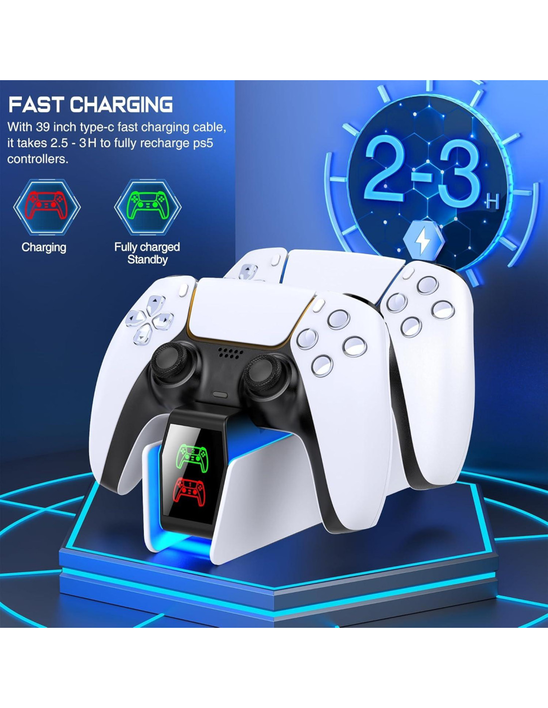 - Mejorado con Adaptador de CA para Carga de Controladores DualSense y DualSense Edge Luz Ambiental LED Diseñada para cargar simultáneamente hasta dos controladores inalámbricos DualSense, esta estación de carga también es compatible con controladores DualSense Edge. La estación de carga del controlador PS5 cuenta con luz ambiental LED en ambos lados, creando un ambiente relajante y romántico que te hará sentir inmerso y relajado. Notarás una diferencia significativa con este kit de accesorios para el controlador ps5 para el PS5 DualSense